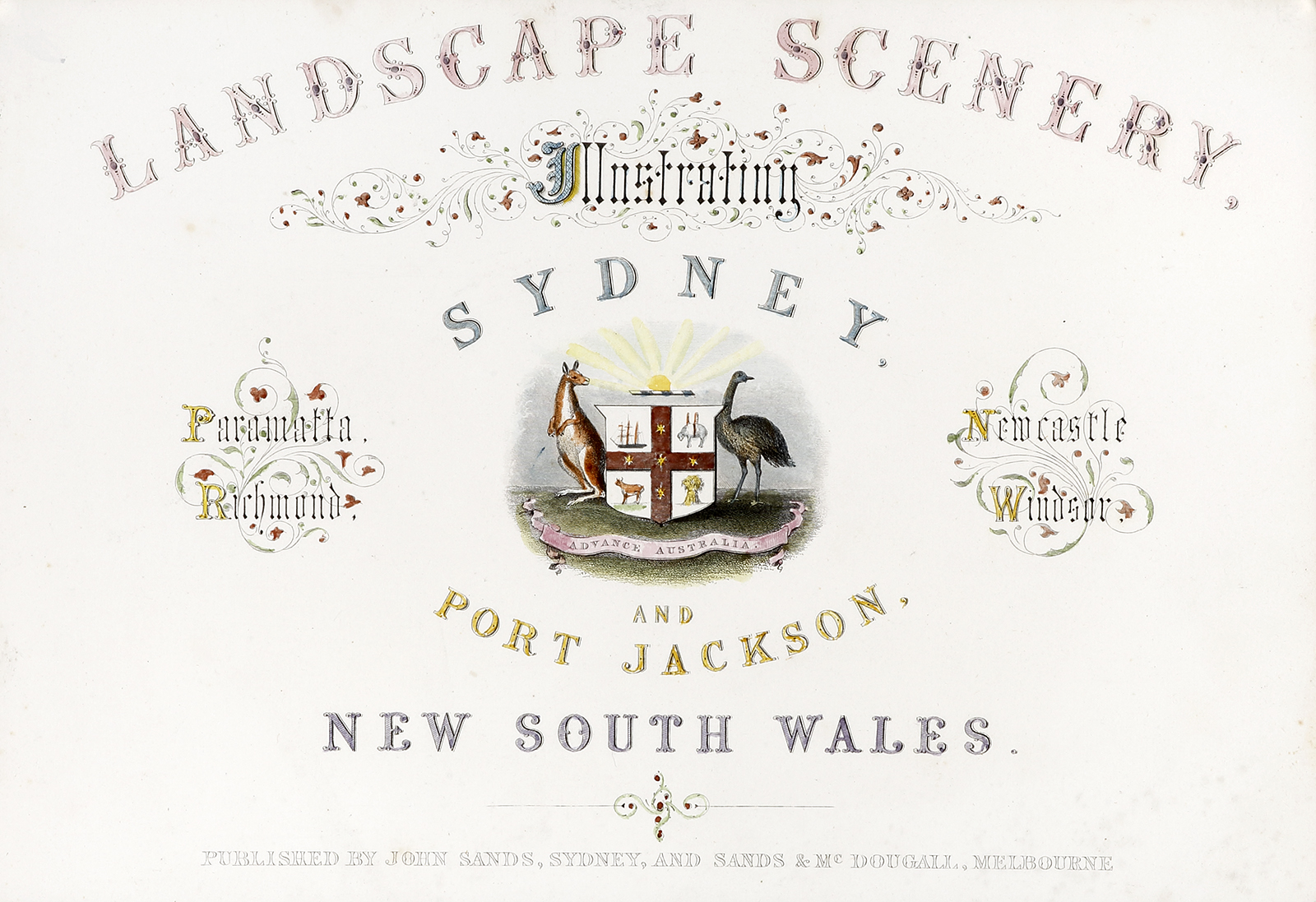 Scarce, hand coloured c.19th engraved title page for Landscape Scenery by F.C. Terry, printed in 1854 comprising the Australian coat of arms.