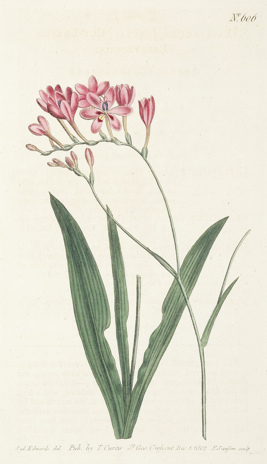 Fine original hand coloured botanical illustration of the Cut-leaved Lapeyrousia from Curtis’s Botanical Magazine: or, Flower-Garden Displayed.