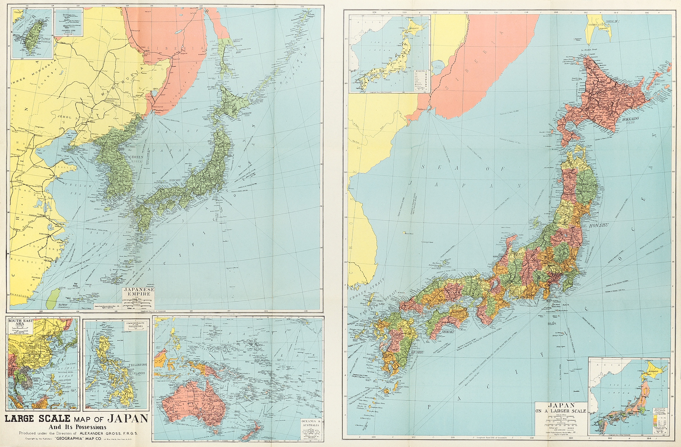 The map if folded has the title, Large Scale Map of Japan and Adjacent Areas on one corner and a large map of Asia. On the verso are a number of maps; two large ones of Japanese Empire and Japan on a Larger Scale. There are five smaller inset maps of; South East Asia, Commonwealth of the Philippines, Oceania & Australia, [Japan Density of Population] and [Mineral deposits in Japan].