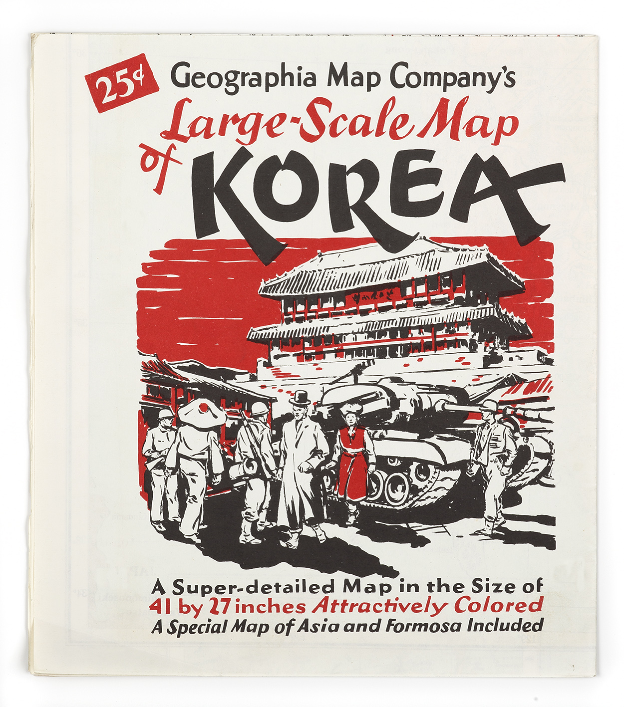 Large folded World War II era map of Korea. The map if folded has the title, Large Scale Map of Kora in one corner and on the same sheet four maps in black white; Formosa  Across the Arctic from U.S.A. … Read Full Description