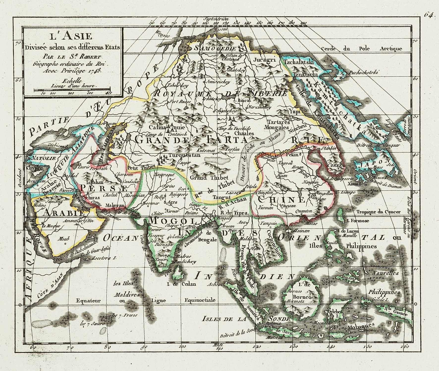 Scarce c.18th French, detailed hand coloured engraved map of Asia by Robert de Vaugondy (1688-1766).