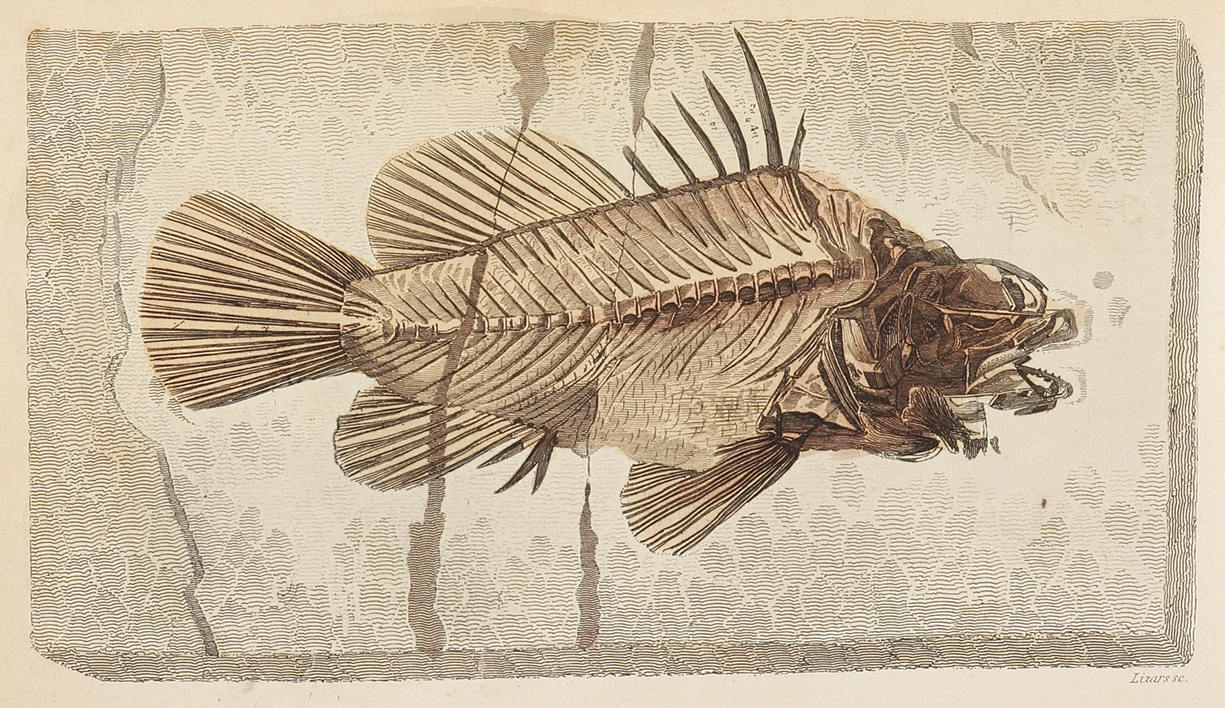 Early engraving of a extinct member of the Perch family, first described by Agassiz in 1833. From the original edition of the Naturalists Library.