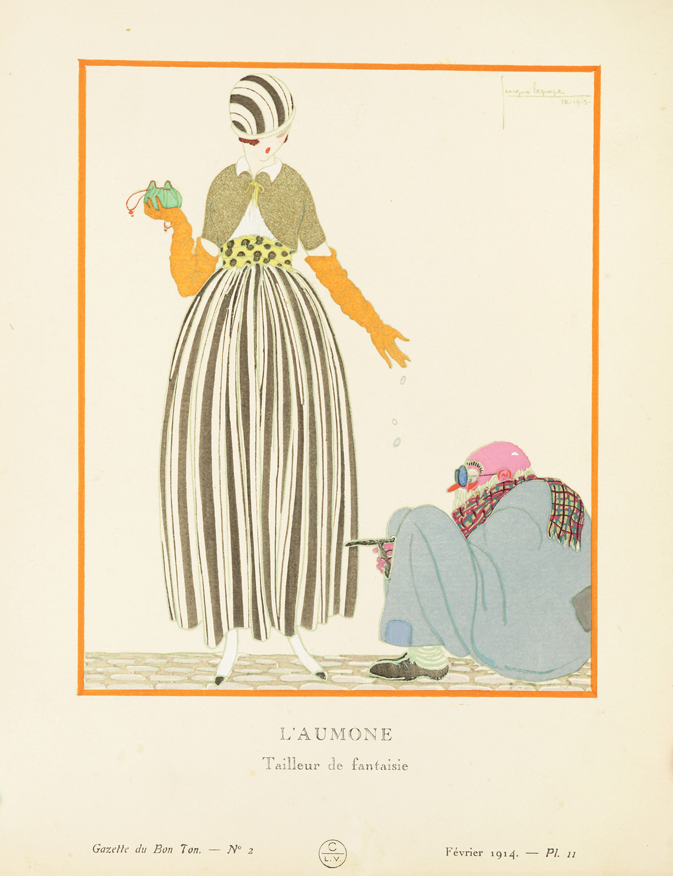Pochoir fashion print from “Gazette du Bon Ton”, published by Lucien Vogel and his artists all of whom were trained at the Ecole des Beaux Arts.