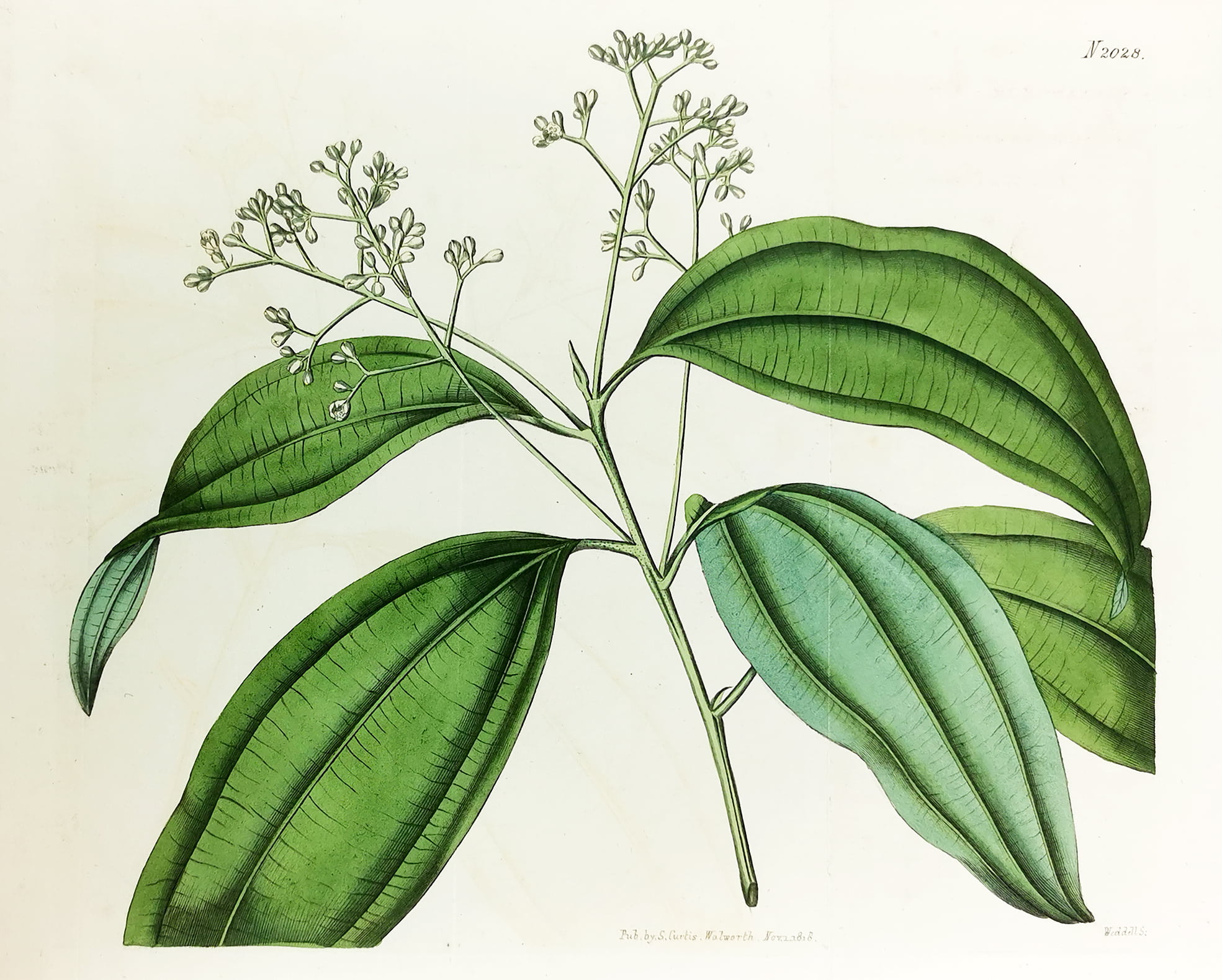 Fine original hand coloured botanical illustration of the Cinnamon-Tree. From Curtis’s Botanical Magazine: or, Flower-Garden Displayed.