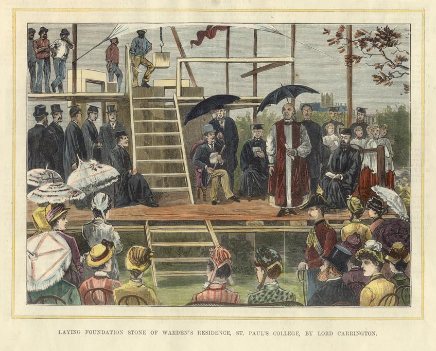 Rare engraving of the laying of the foundation stone of St. Paul’s College, Sydney University in 1886 by Lord Carrington.