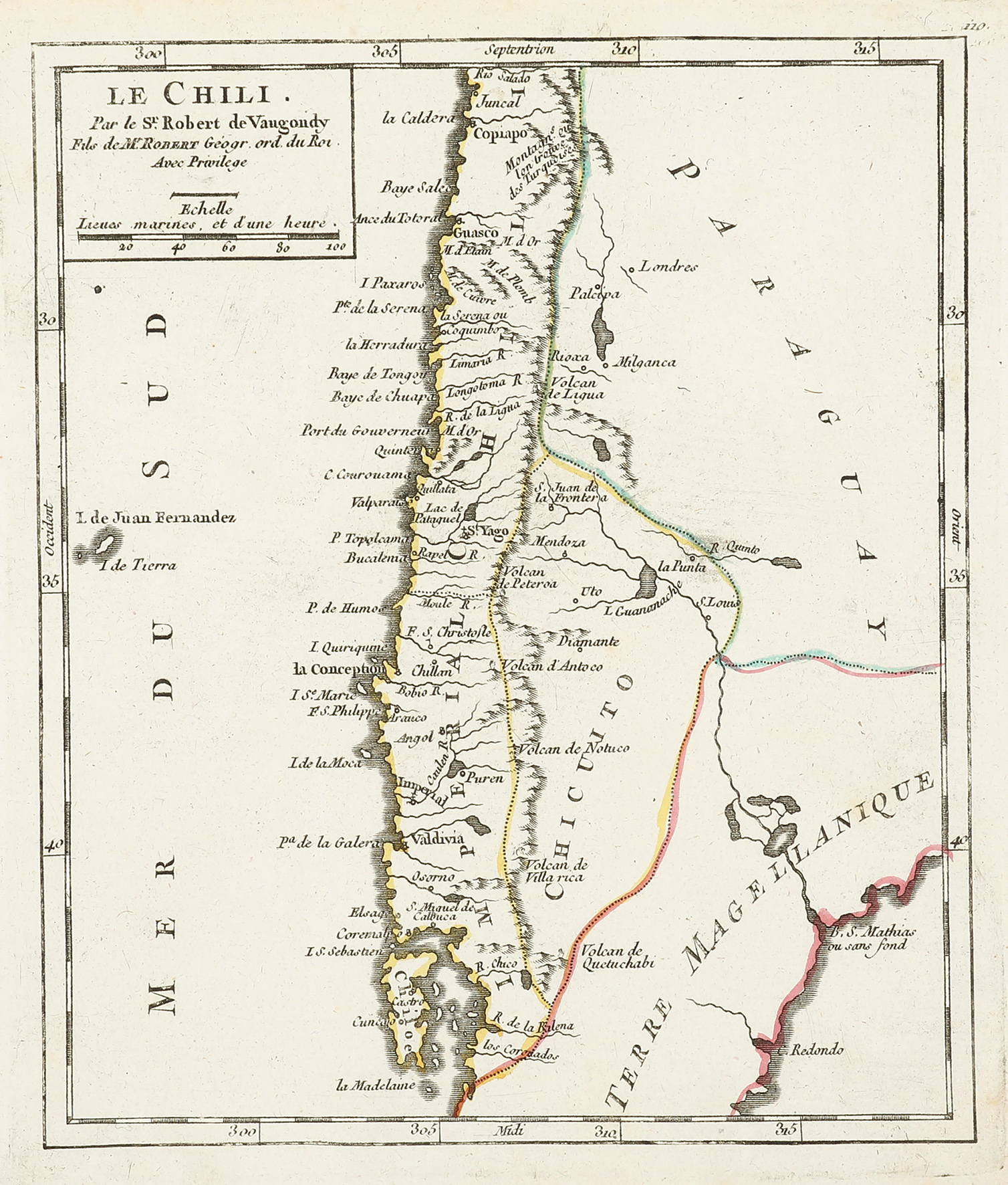 Scarce c.18th French hand coloured engraved map of Chile by Robert de Vaugondy (1688-1766). From: Rovert de Vaugondy, Atlas portatif, universel. Composé d’après les meilleures cartes, tant gravées que manuscrites, des plus célèbres géographes et ingénieurs. Paris