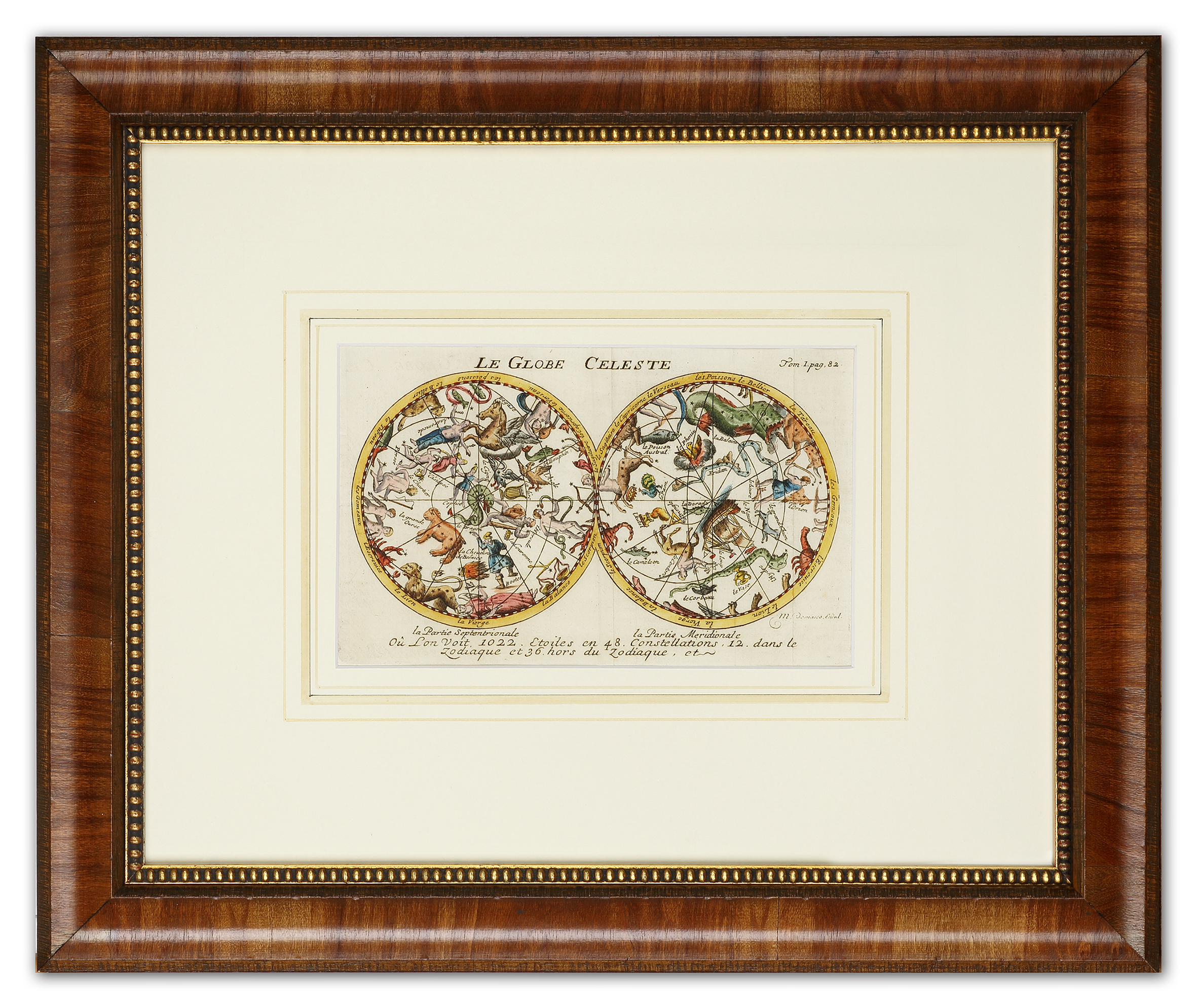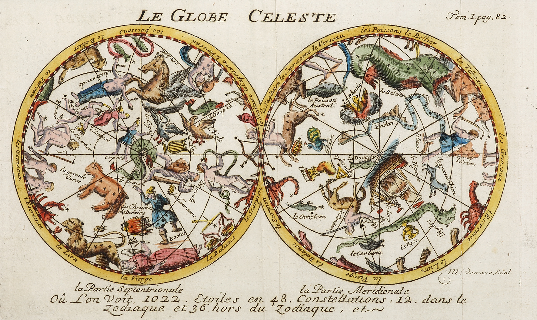 Very decorative and detailed C18th celestial chart . From: De La Croix, Nouvelle methode pour apprendre facilement la Geographie universelle