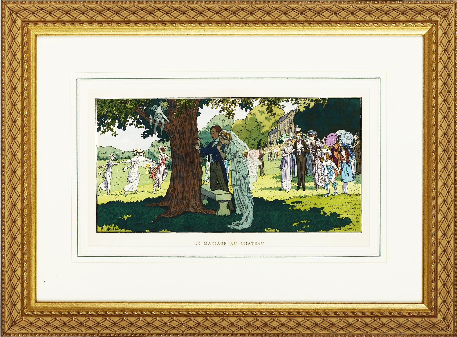 Shows to newly weds inscribing a tree with Cupid perched on a branch watching on.