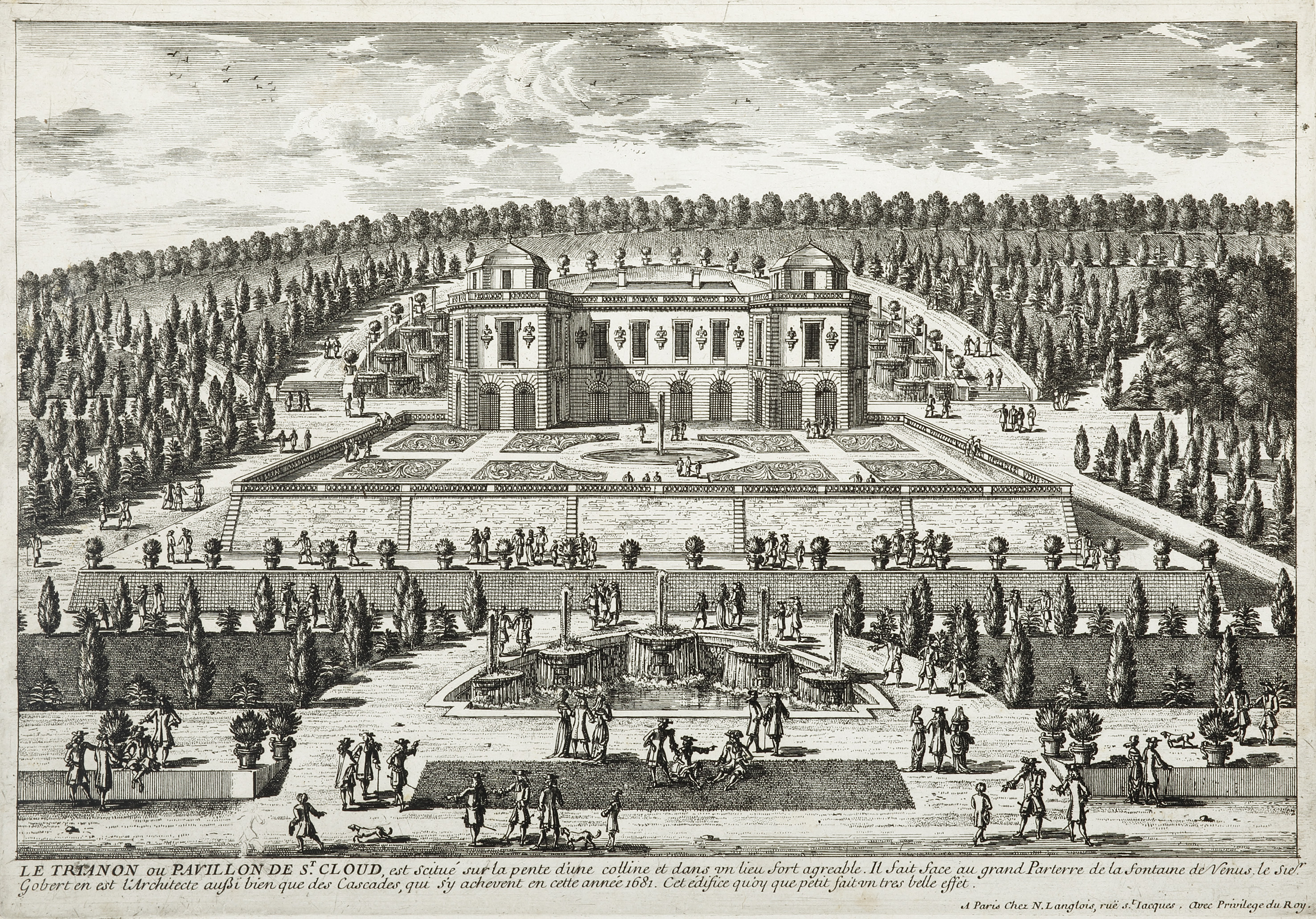 This beautiful architectural engraving is from an extensive and fine series of engravings depicting the major French chateaux and gardens, including Versailles and Fountaine Bleau, and Parisian views and architectural landmarks. Although no two albums of topographical views of France with engravings by the Perelle family are identical, they can be dated variously from about 1750 to 1800, and were issued by any one of four generations of the Langlois and Mariette family of publishers.