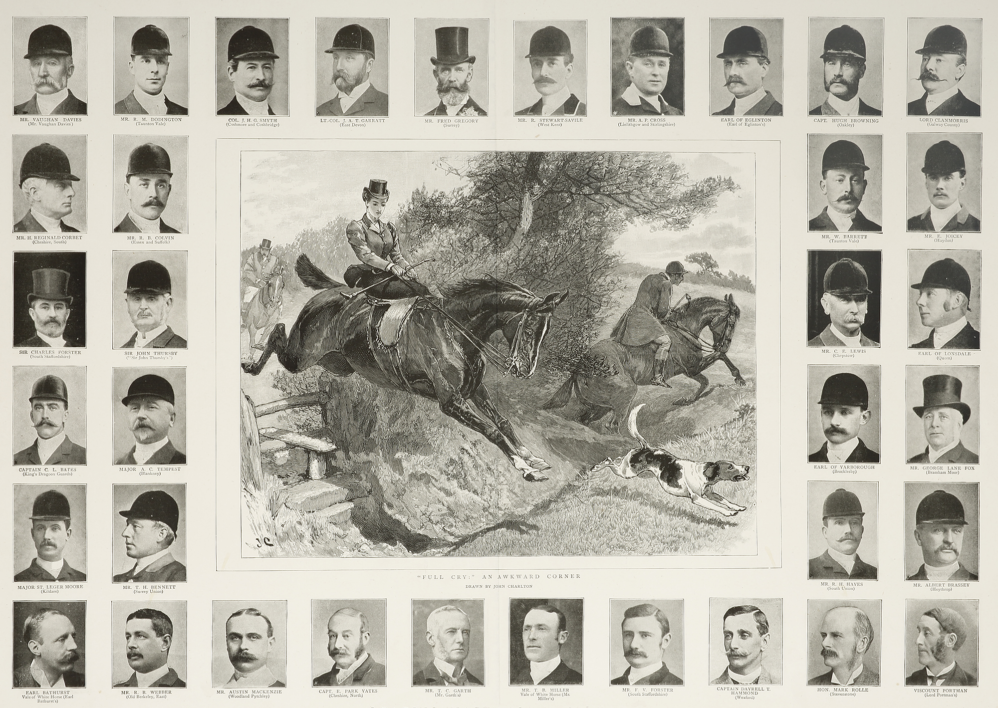 Superb hunting engraving with a lady riding saddle jumping a fence, the scene surrounded by portraits of Masters of the Hounds. From the original edition of The Graphic.