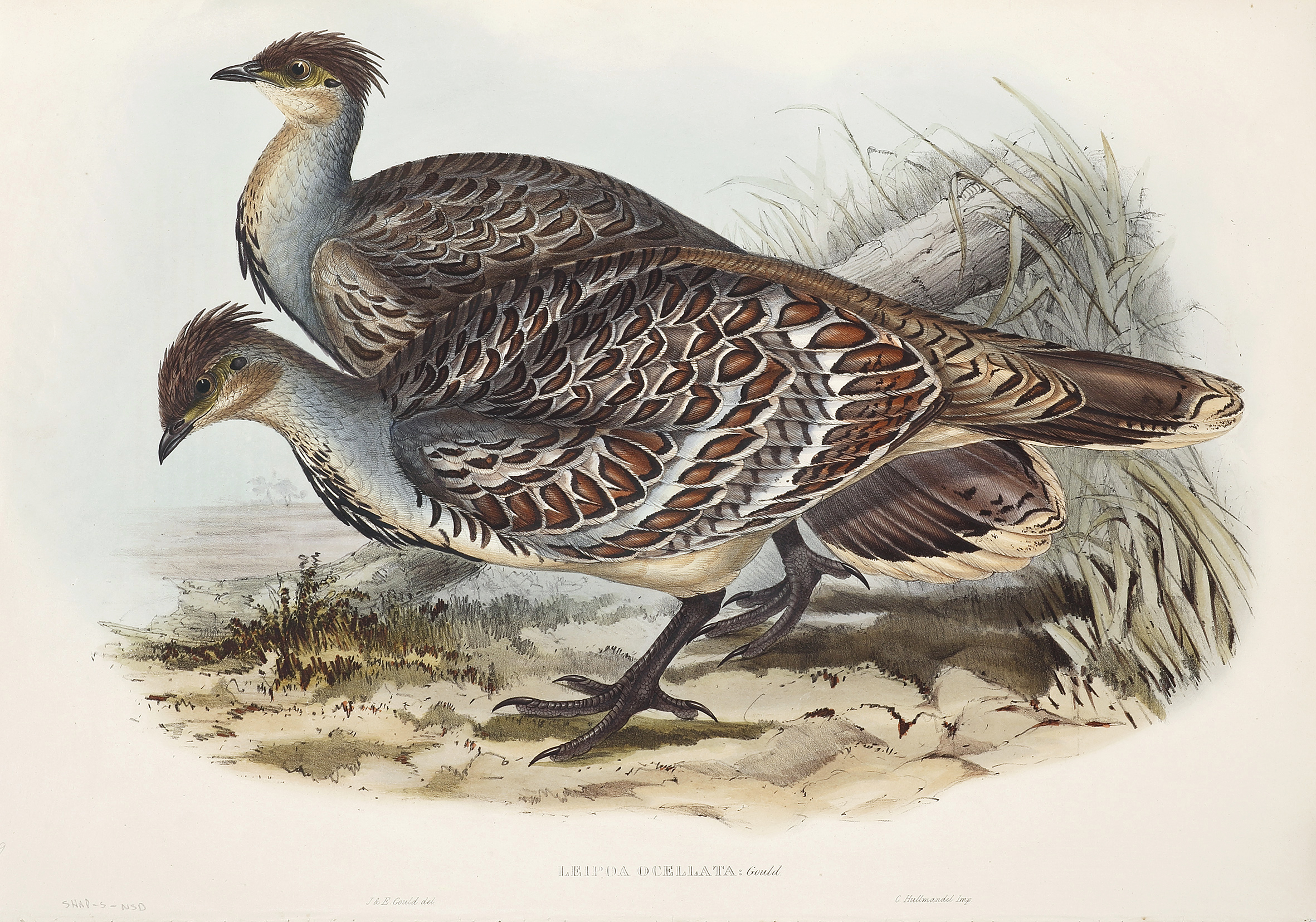 Spectacular lithograph of the best and largest colonial image of the Malleefowl by John Gould, from his epic series, The Birds of Australia and Adjacent Islands, published for the author, printed by Richard and John E. Taylor, London.