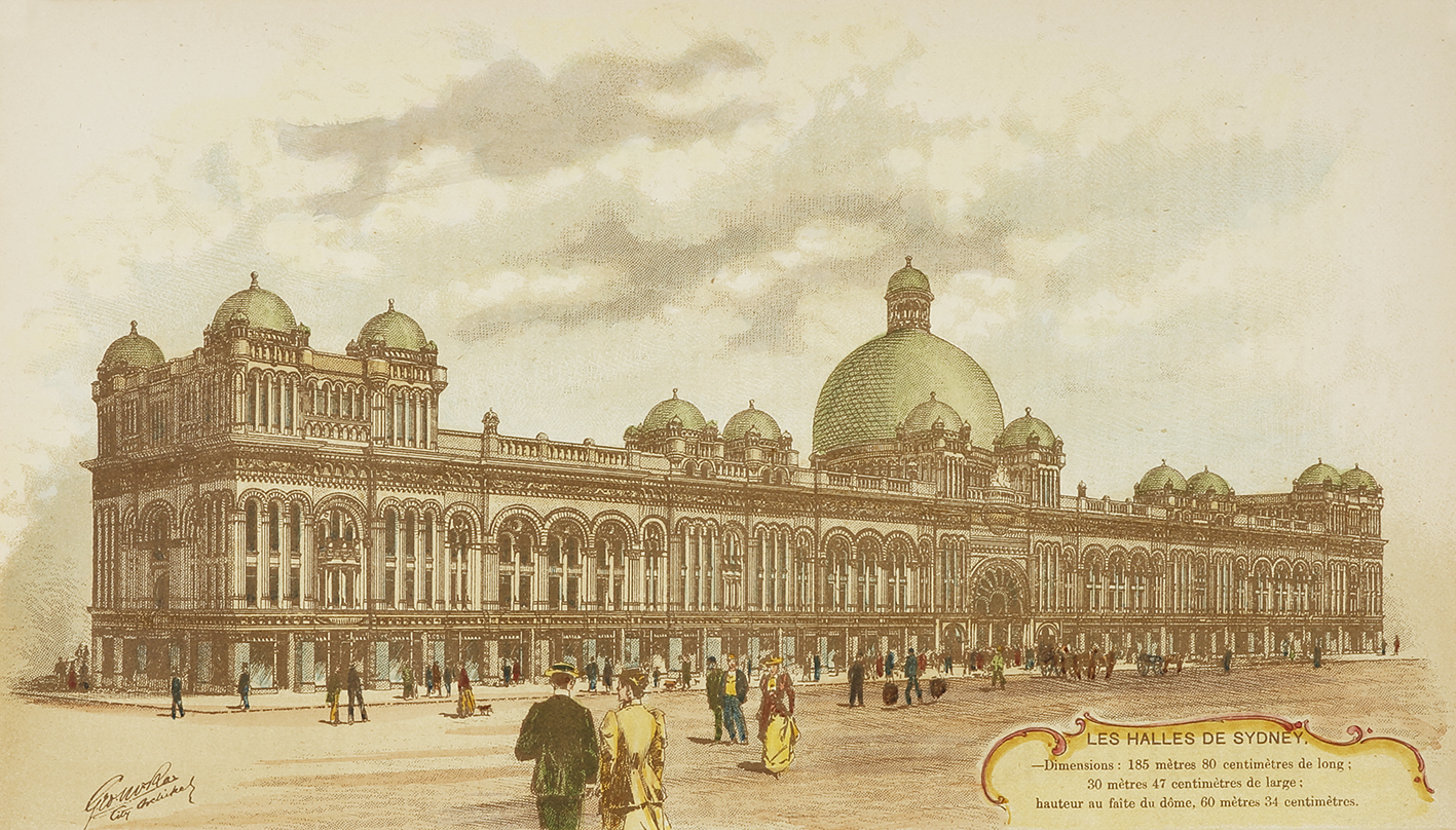 A scarce c.19th French lithograph of the Queen Victoria Building, designed by the architect George Rae. The QVB occupies the entire block bound by George, Druit, York and Market Streets. It is 610 feet long,100 feet wide height to top of dome 198 feet.