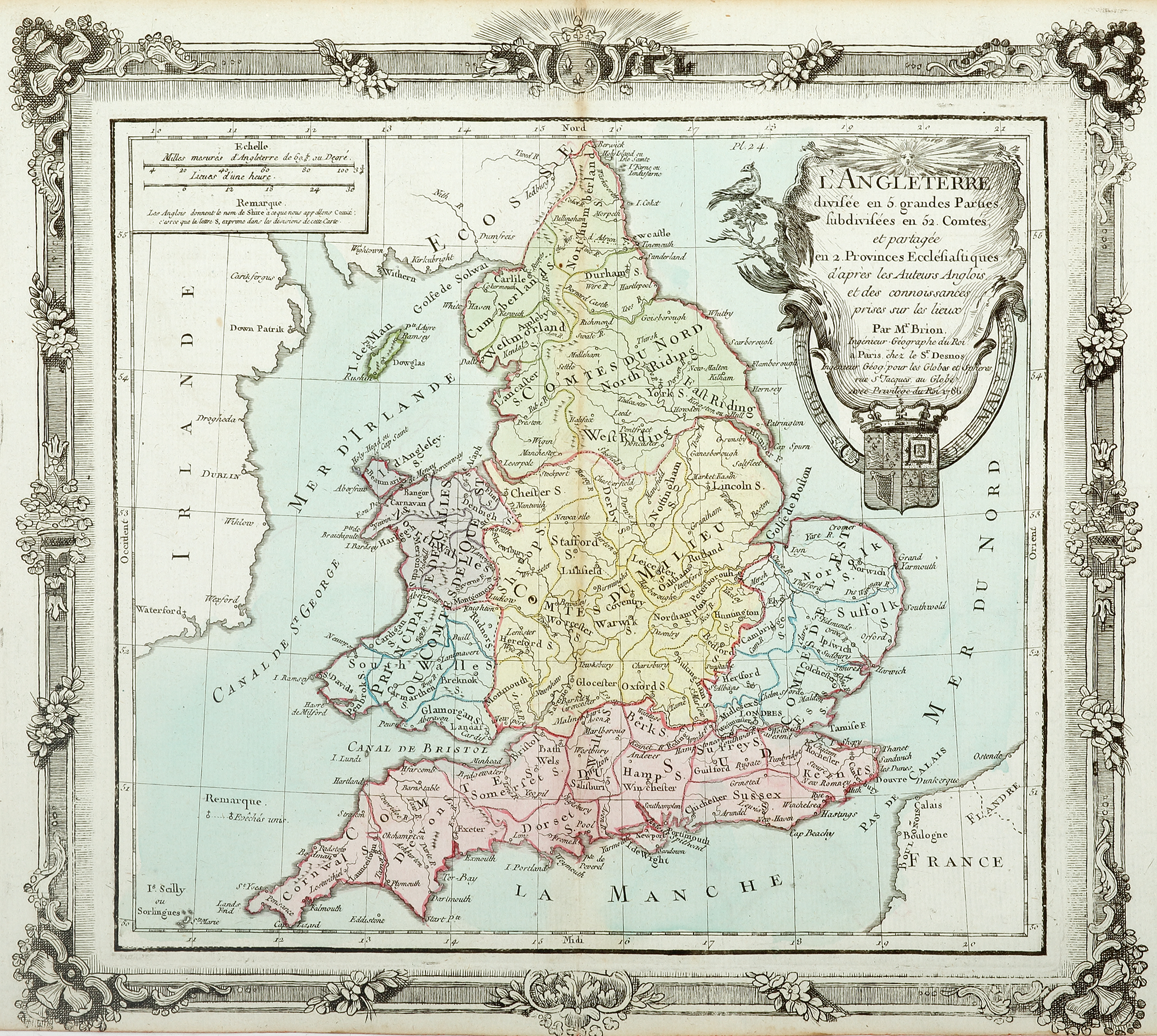 Beautiful map of the British Isles with an elaborate title cartouche and decorative frame border design. From Desnos, Atlas General, Civil, Ecclesiatique et Militaire…., Paris.