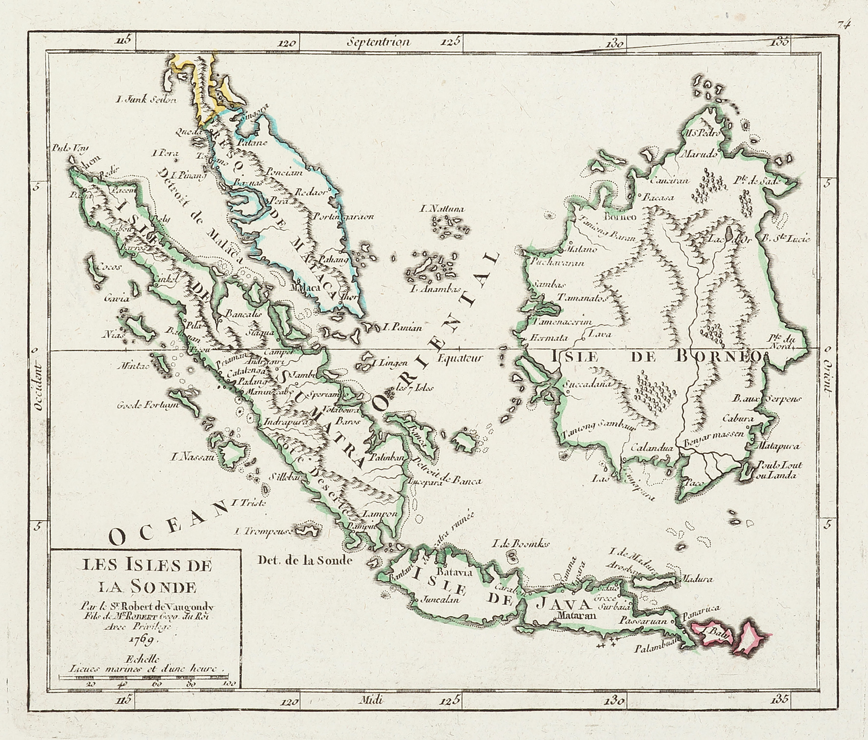 Scarce c.18th French hand coloured engraved map of the East Indies depicting Sumatra, Java, Borneo and Malacca by Robert de Vaugondy (1688-1766). From: Robert de Vaugondy, Atlas portatif, universel. Composé d’après les meilleures cartes, tant gravées que manuscrites, des plus … Read Full Description