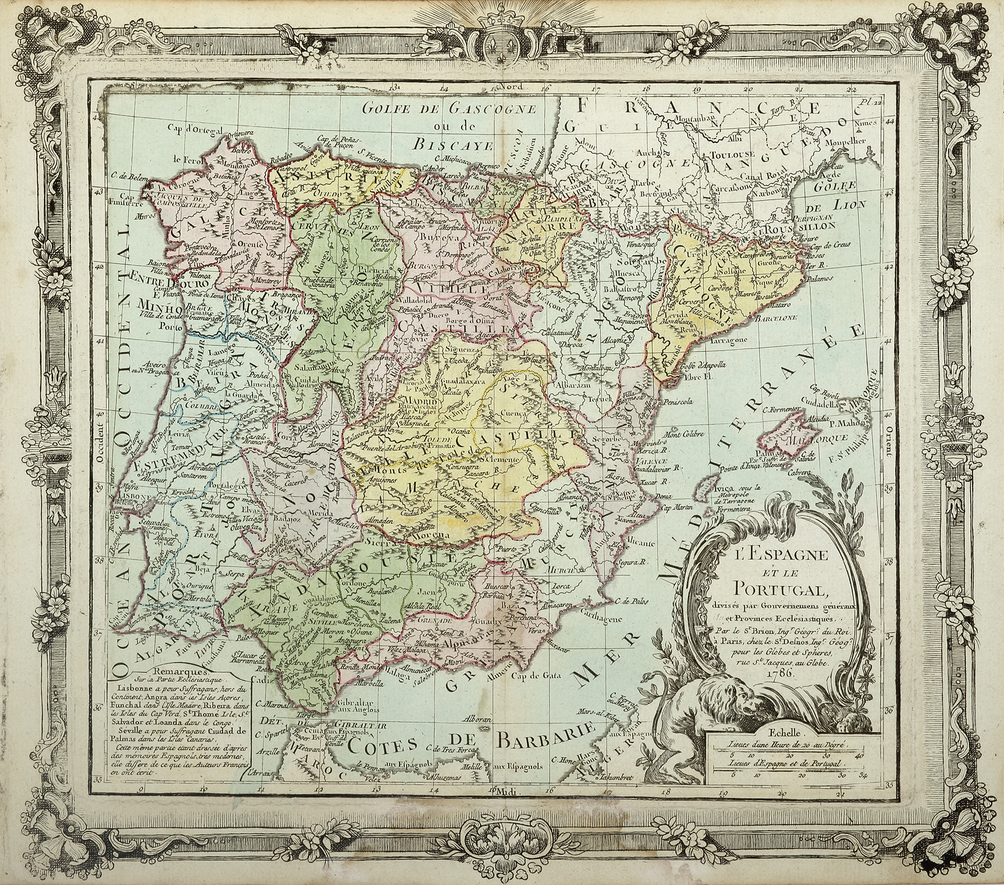 Beautiful map of Spain and Portugal with an ornate Rococo frame border and title cartouche. From Desnos, Atlas General, Civil, Ecclesiatique et Militaire…., Paris.