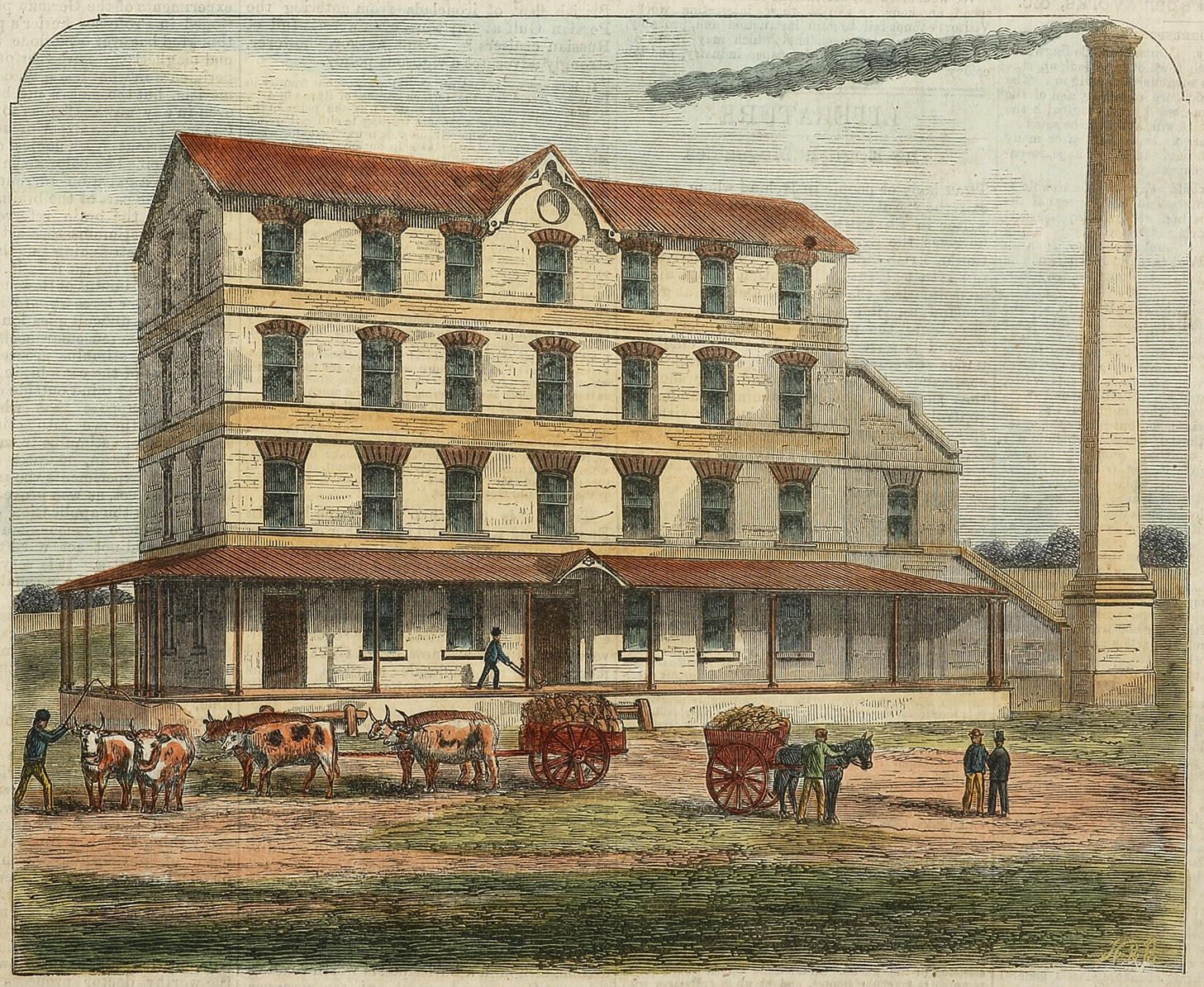 Rare colonial engraving of Lewin Brothers Flour Mill, on the corner of White and Flour Street. From the original edition of the Town and Country Journal.