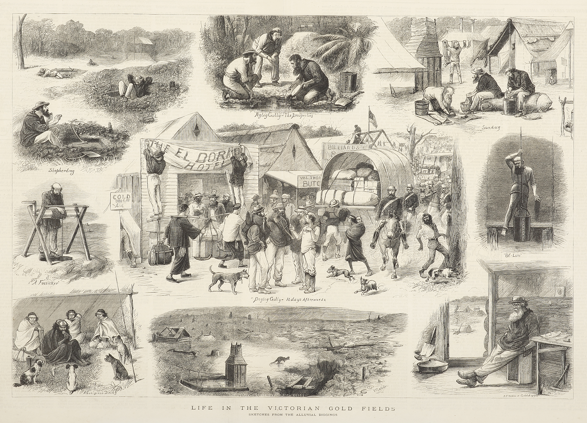 Large colonial period engraving reflecting twenty five years after the discovery of gold in Victoria. Inset titles; Pegleg Gully-the Prospectors, Shepherding, A Fossicker, Aborigines Dining, Sunday, “Be-Low”, Pegleg Gully-10 days Afterwards, Pegleg Gully 12 Months Afterwards, 25 Years a Gold … Read Full Description