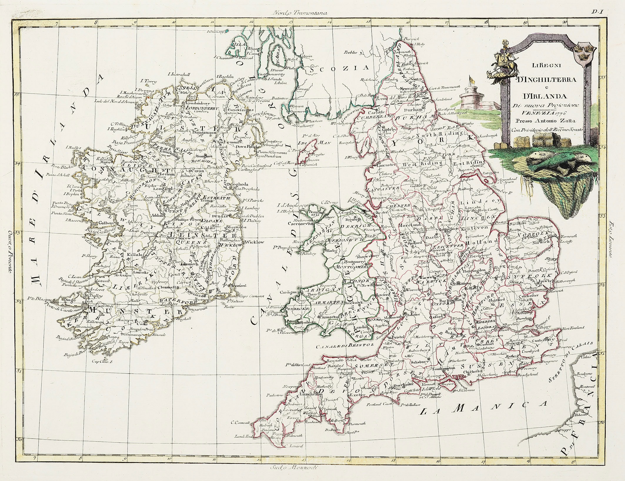 Rare c.18th detailed hand coloured Italian map of England and Ireland by Antonio Zatta with an elaborate title cartouche.