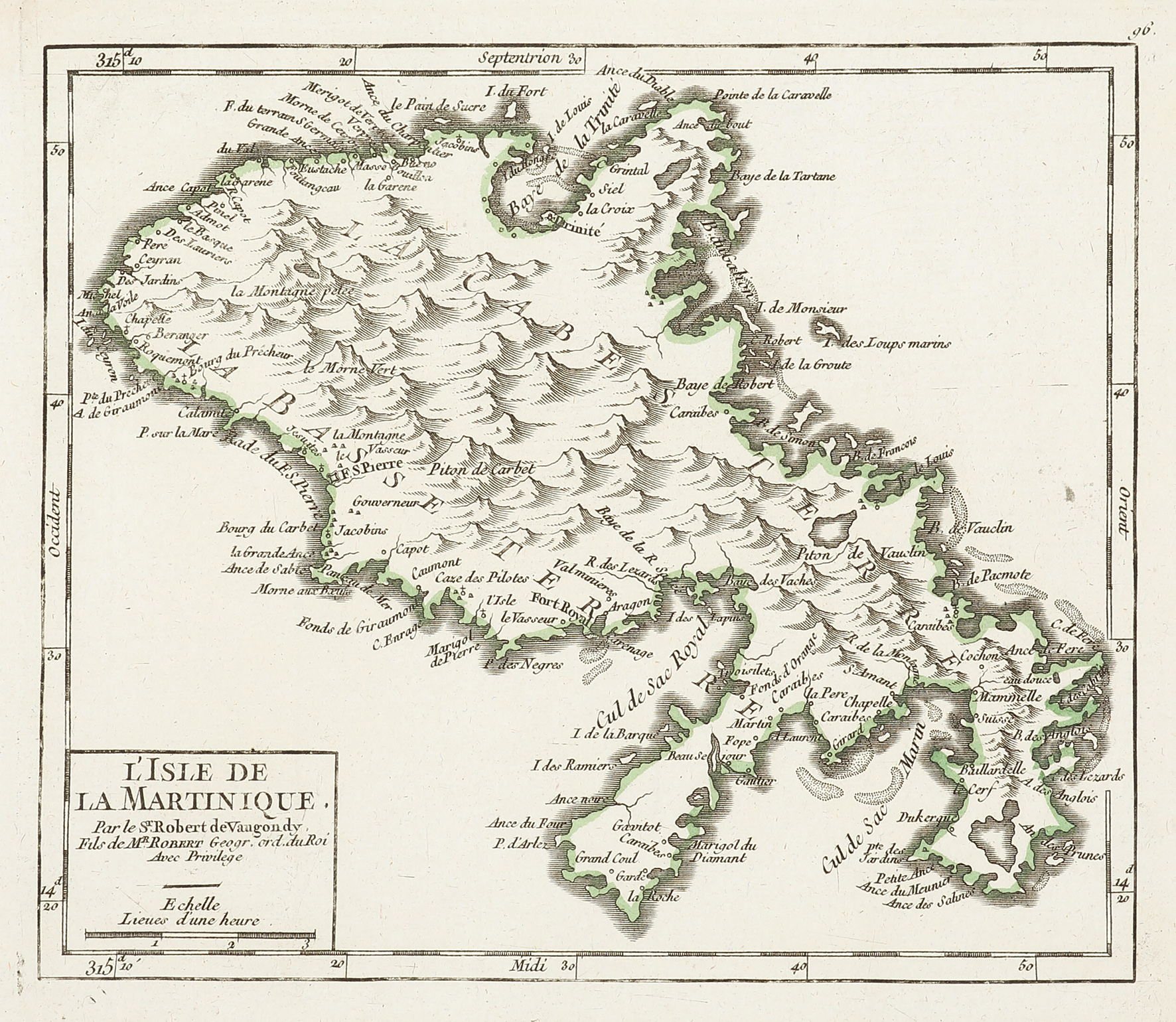 Scarce c.18th French hand coloured engraved map of Martinique a French island in the Caribbean Sea by Robert de Vaugondy (1688-1766). From: Robert de Vaugondy, Atlas portatif, universel. Composé d’après les meilleures cartes, tant gravées que manuscrites, des plus célèbres … Read Full Description