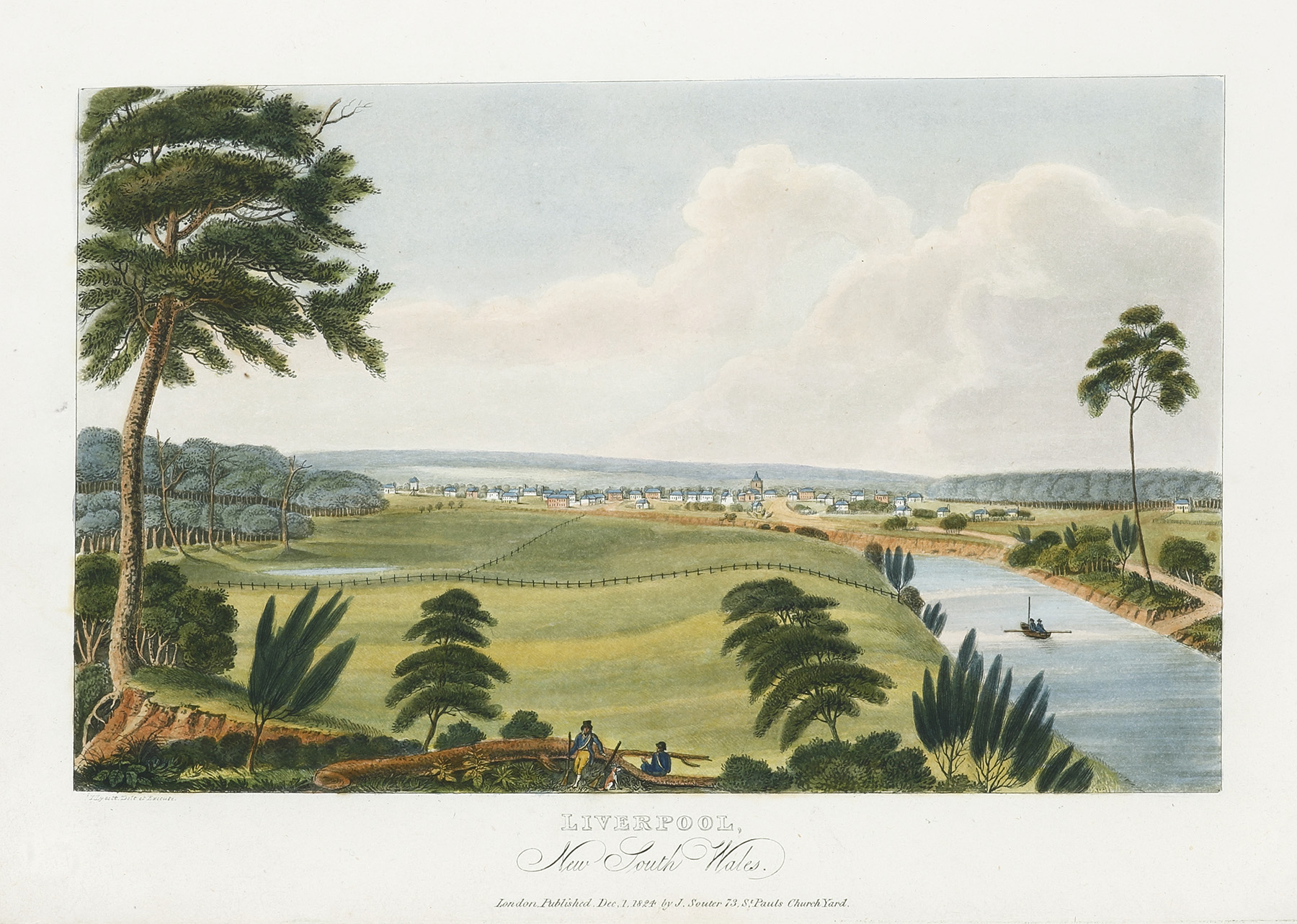 Rare c.19th aquatint view of Liverpool, New South Wales by the convicted forger, Joseph Lycett. Liverpool was founded 7 November 1810 on the banks of the Georges River, as an agricultural area by Governor Lachlan Macquarie. It was named after Robert Banks Jenkinson, Earl of Liverpool, the Secretary of State for the Colonies.