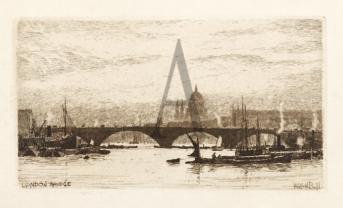 Fine etching of London Bridge and the Thames by Wilfred Ball (1953-1917)