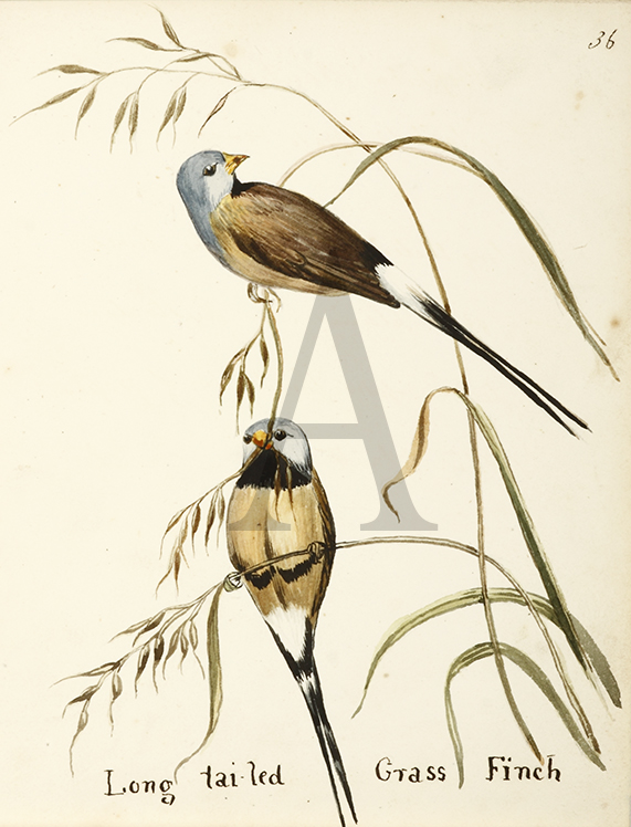 An early unsigned watercolour of a Long-tailed Finch based on plate 230 in John Gould’s, Birds of Australia. With an accompanying sheet of hand written letterpress.