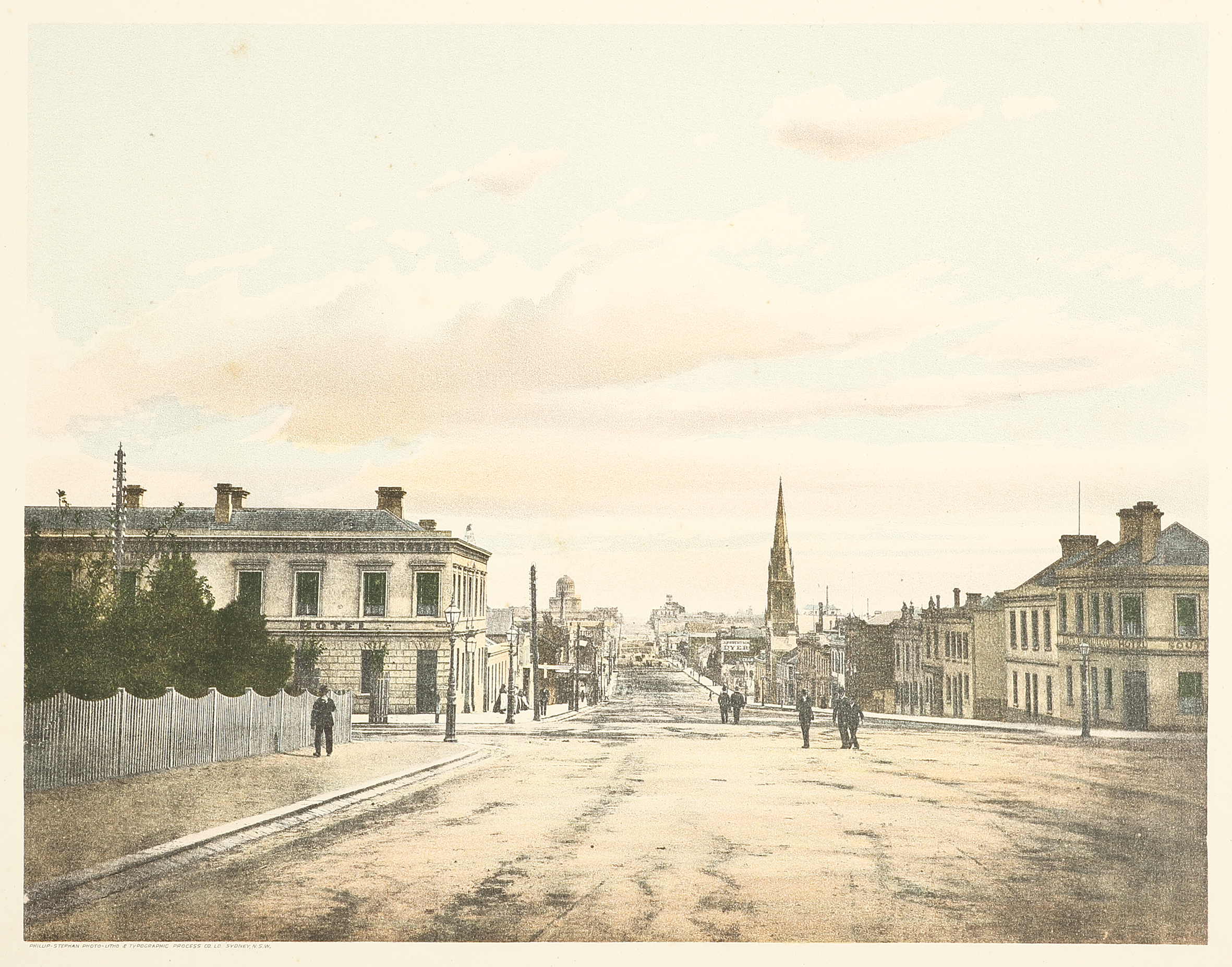 View of Lonsdale Street from the intersection of Spring St. Melbourne. Rare. This series of views were the first examples of the new printing technique of photo lithography. In this method the plate was photo sensitised and the image was … Read Full Description