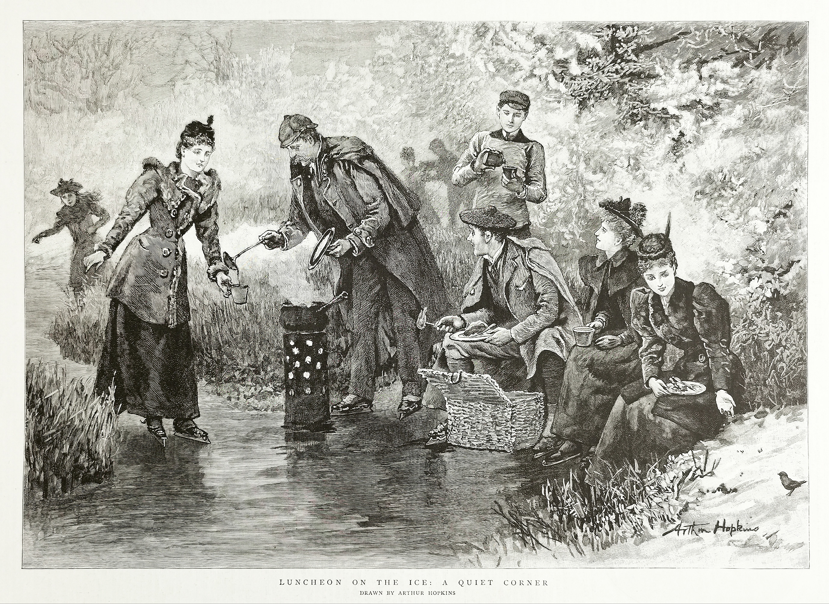 Skaters having a picnic on the ice. From the original edition of The Graphic.