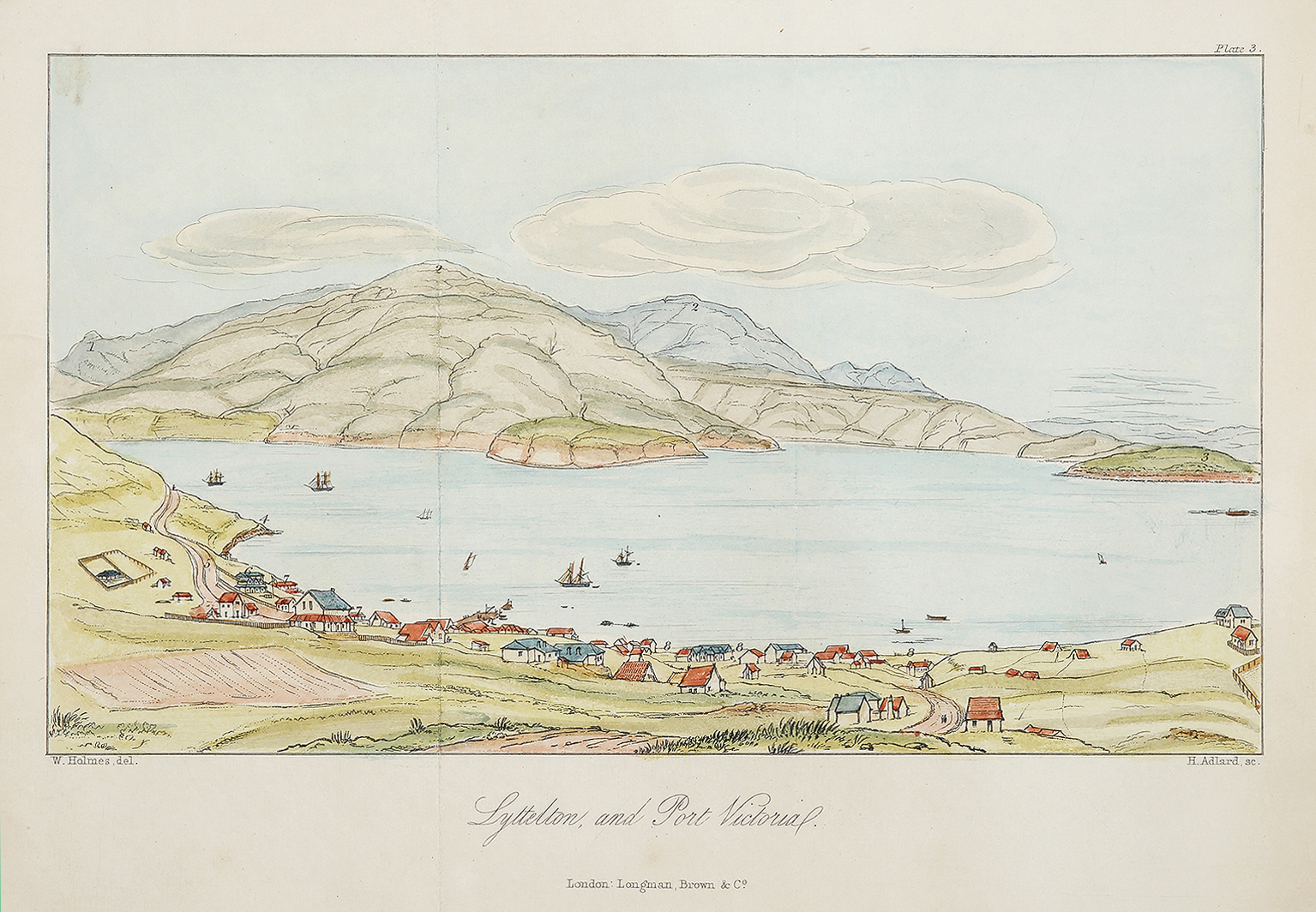 Rare c.19th hand coloured etching of Lyttelon, New Zealand in 1853 by William Howard Holmes (1825 – 1885).