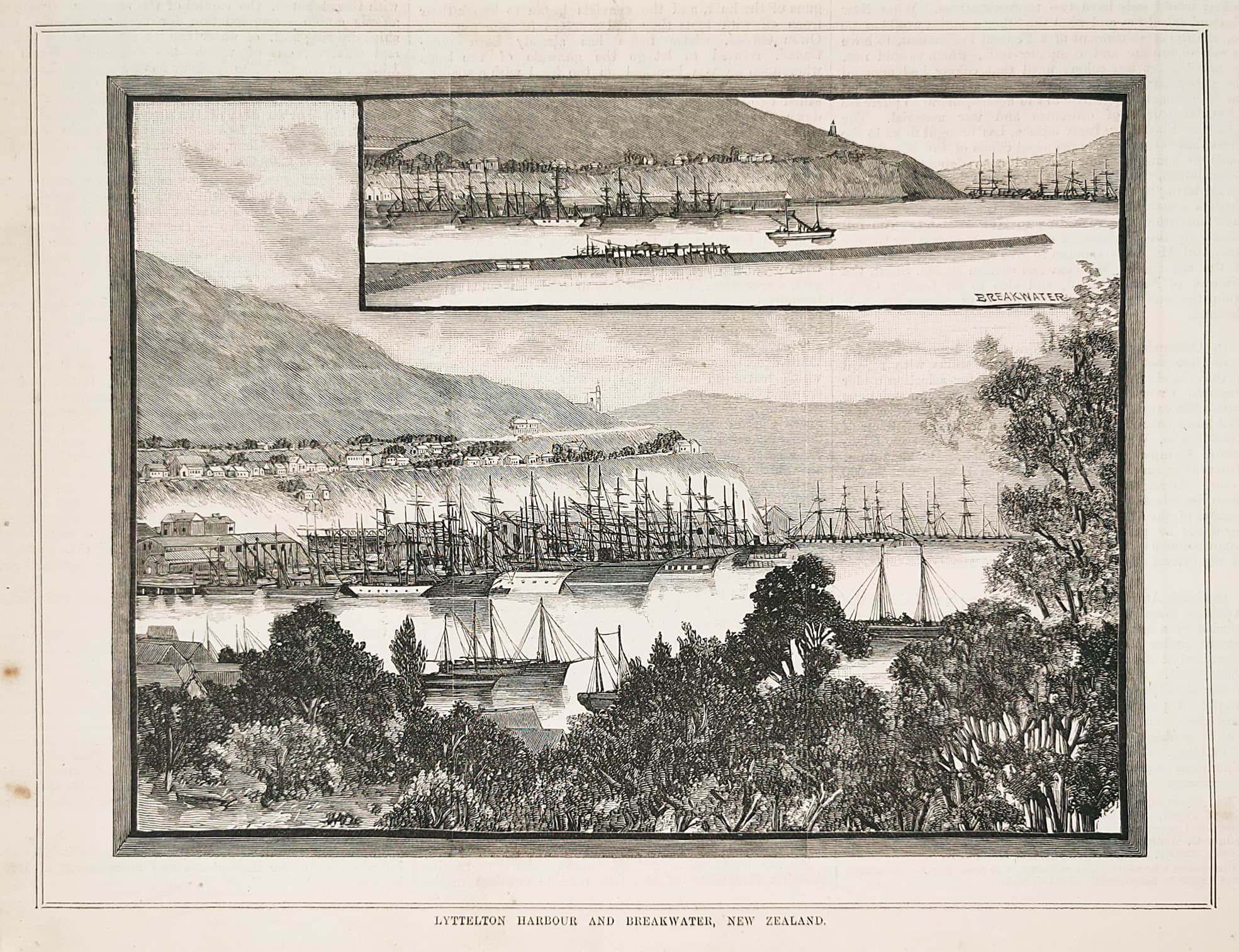 Engraving of Lyttelton Harbour and Breakwater, from the original edition of The Australasian Sketcher.