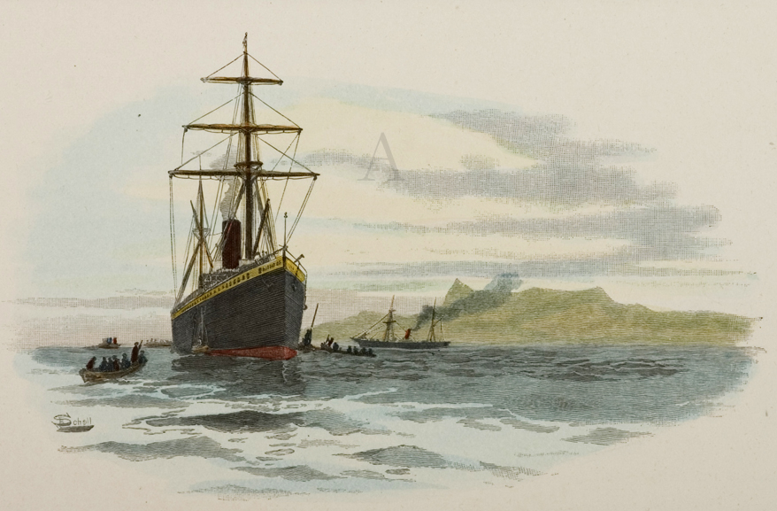 Scarce, c.19th hand coloured engraving of a mail steamer at Tutuila, Samoa in 1886.