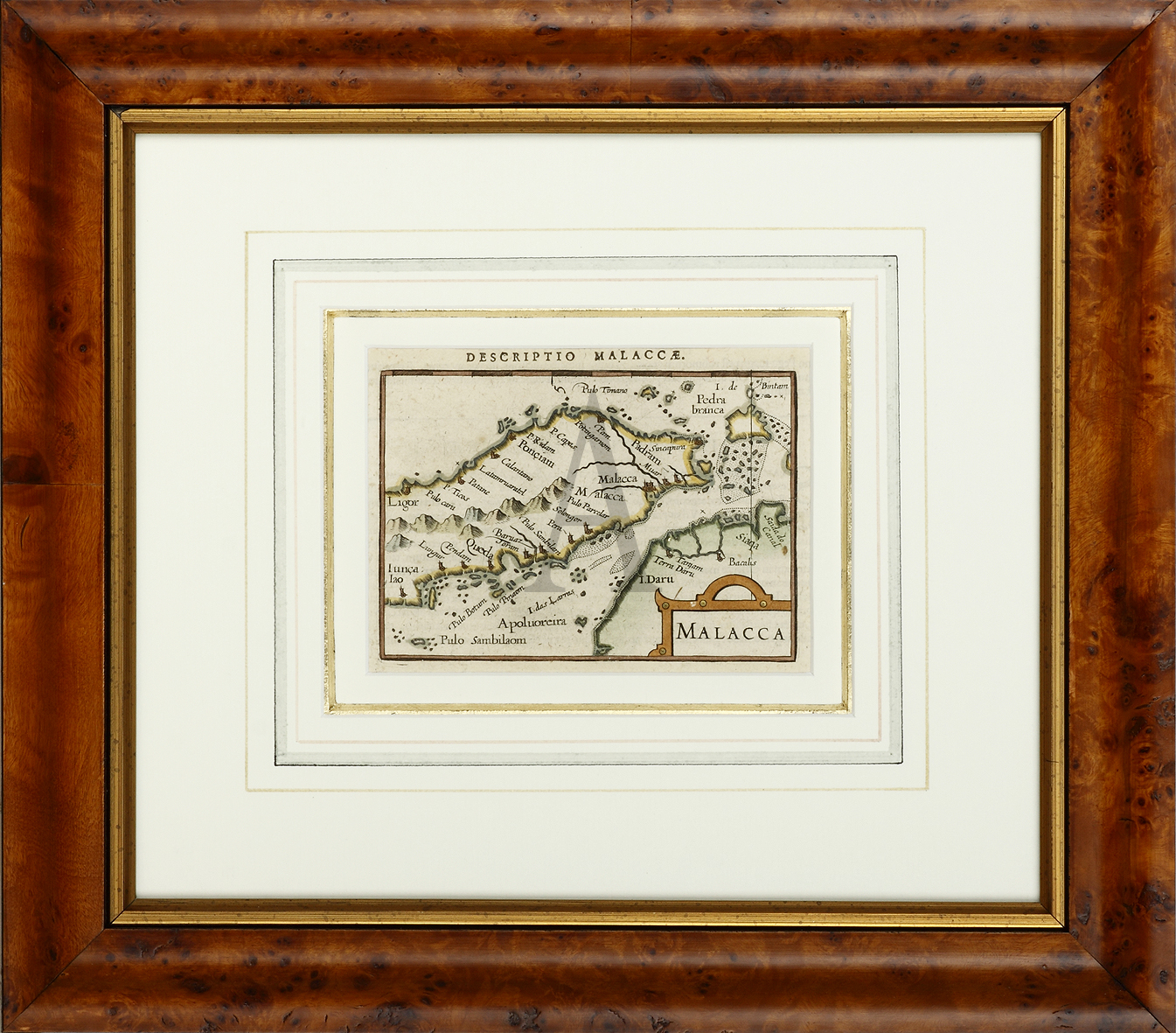 Early map of Malacca from Hondius’s Atlas Minor, based on a map by Jan Huygen van Linschoten, issued in his Travel Accounts of Portuguese Navigation in the Orient (1595), which, for the first time, included secret Portuguese information on the trading routes to the East Indies. Linschoten was in the employ of the Archbishop of Goa and, while in that privileged position, copied navigational information and maps of the Portuguese trading routes. In his Travel Accounts, Linschoten suggested approaching the East Indies from the south of Sumatra through the Sunda Strait, in order to avoid the Portuguese presence in the Malacca Strait.