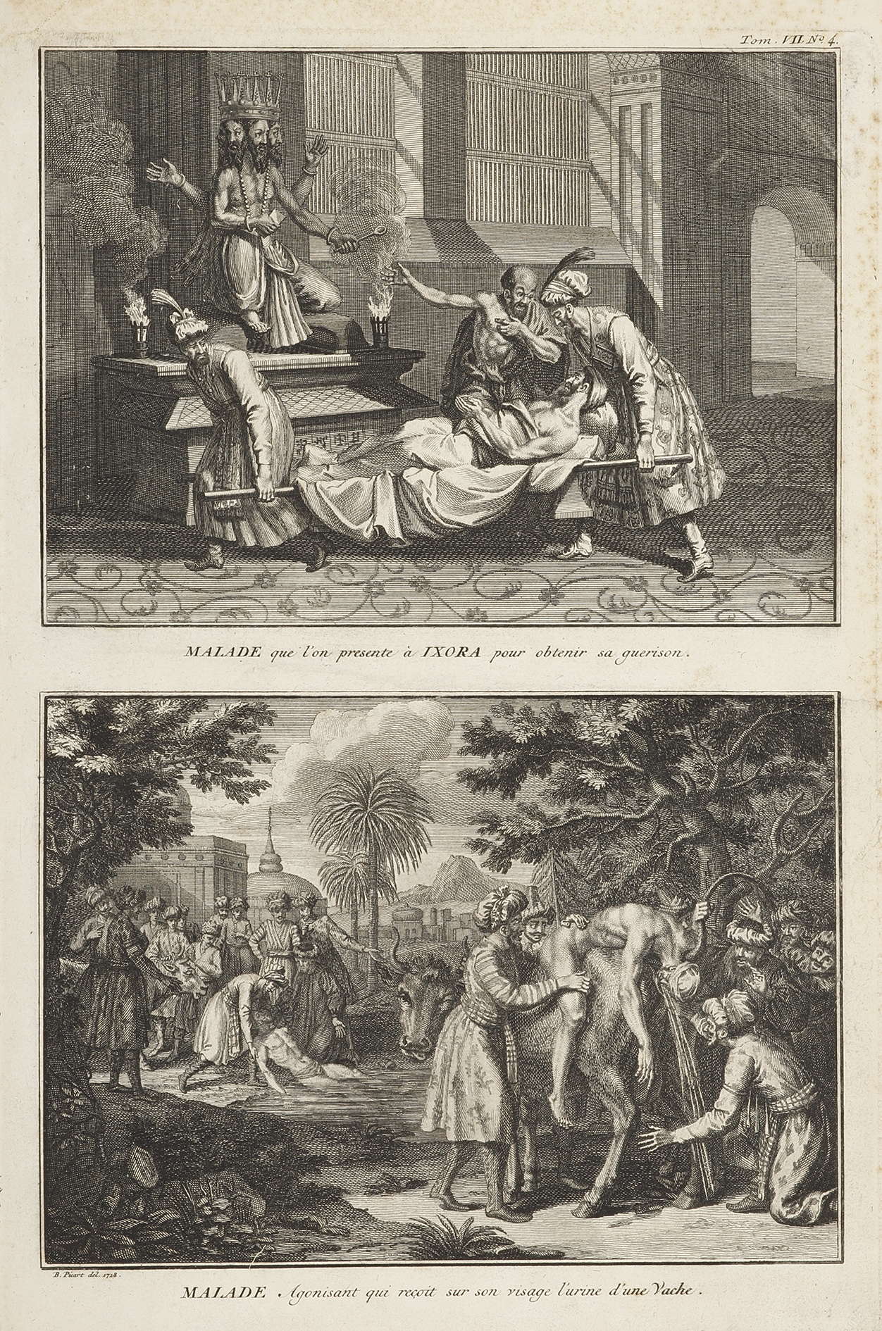 C.18th engravings showing a patient presented to Ixora (Lord Shiva) for a cure and the lower image of the Ayurvedic use of cow urine, Gomutra which isbelieved to cure leprosy, fever, peptic ulcer, liver ailments, kidney disorders and Asthma . … Read Full Description
