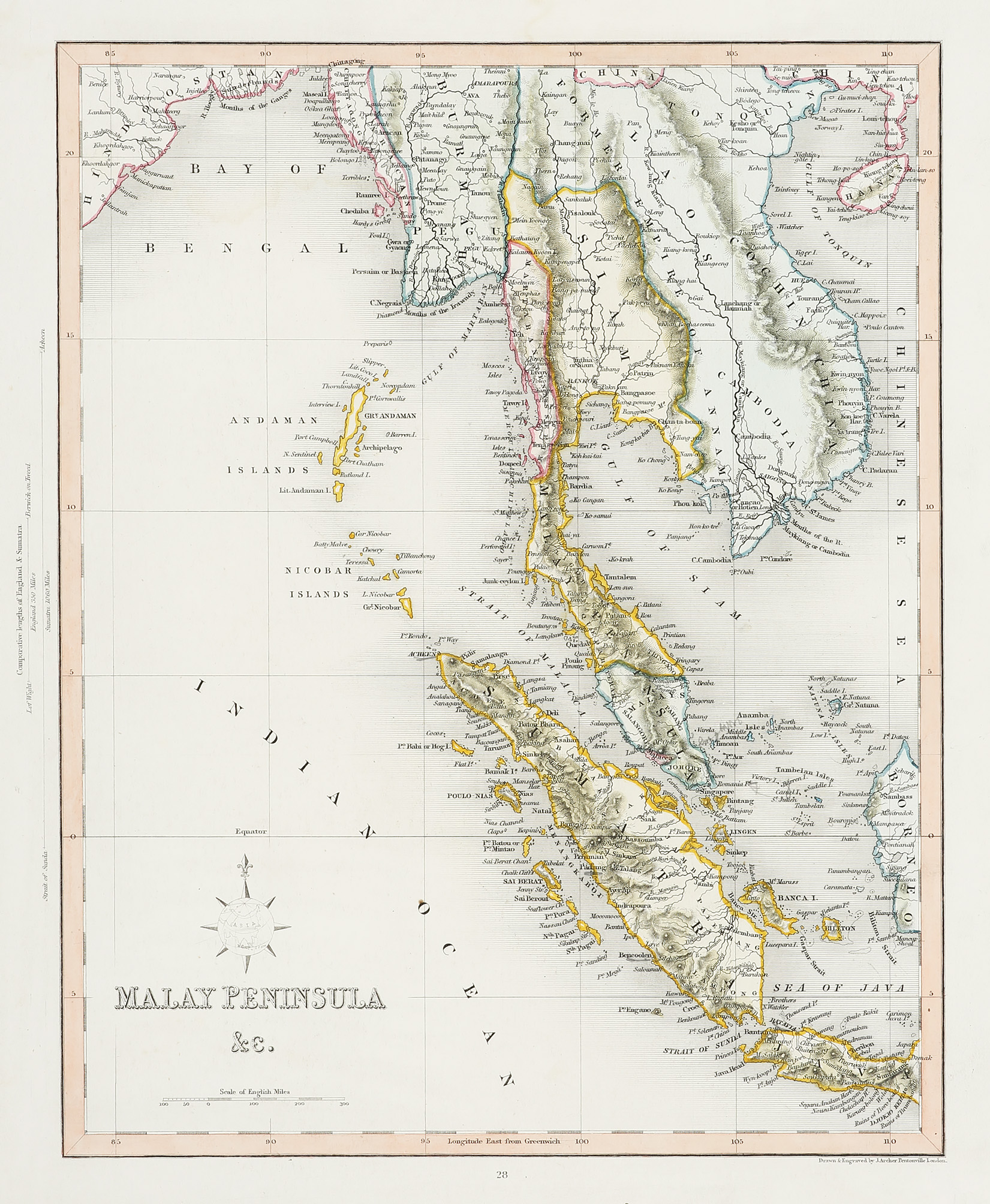 Scarce, finely engraved c.19th hand coloured engraved map of south east Asia.