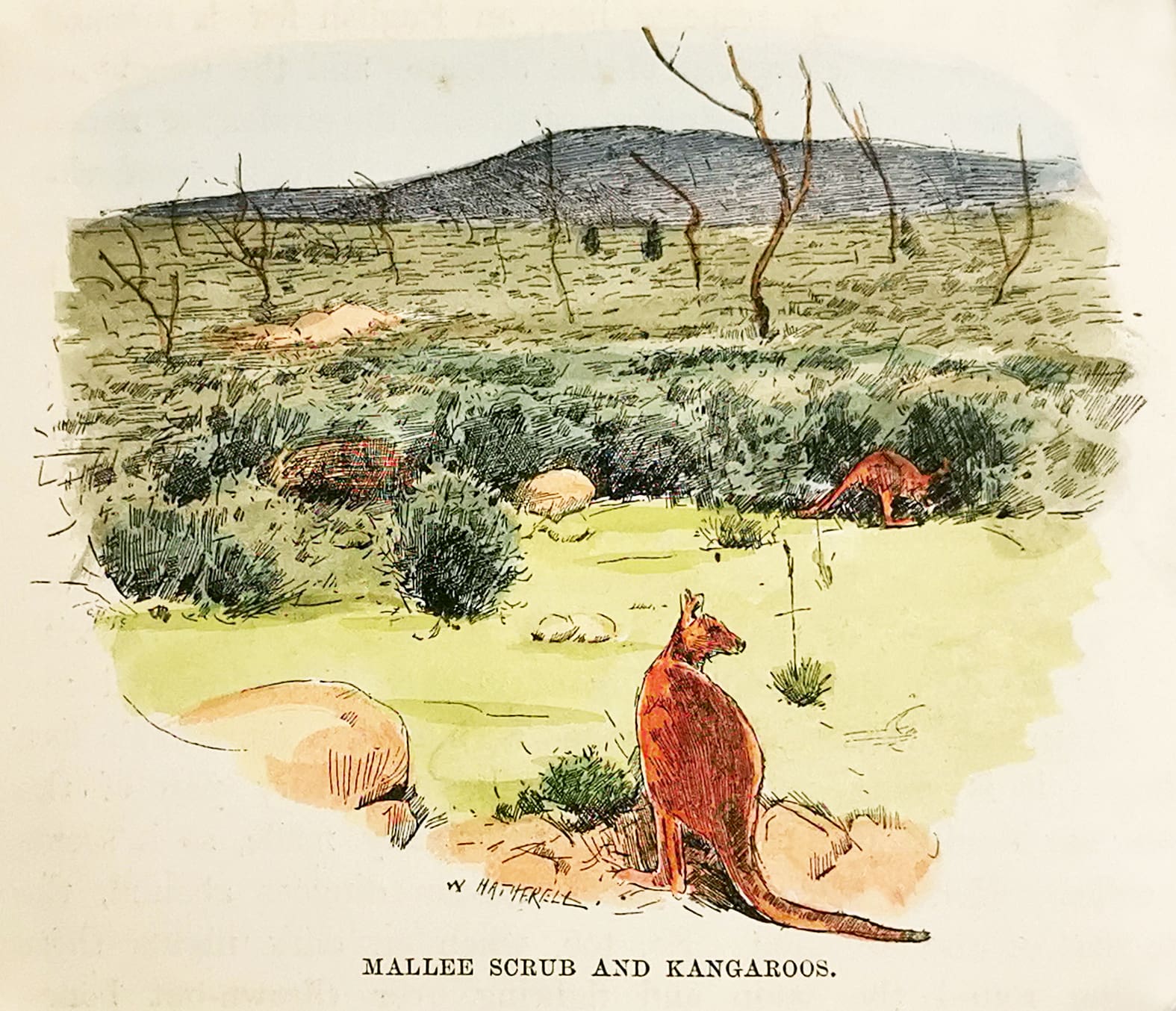 Colonial engraving of a Kangaroos in Mallee scrub.