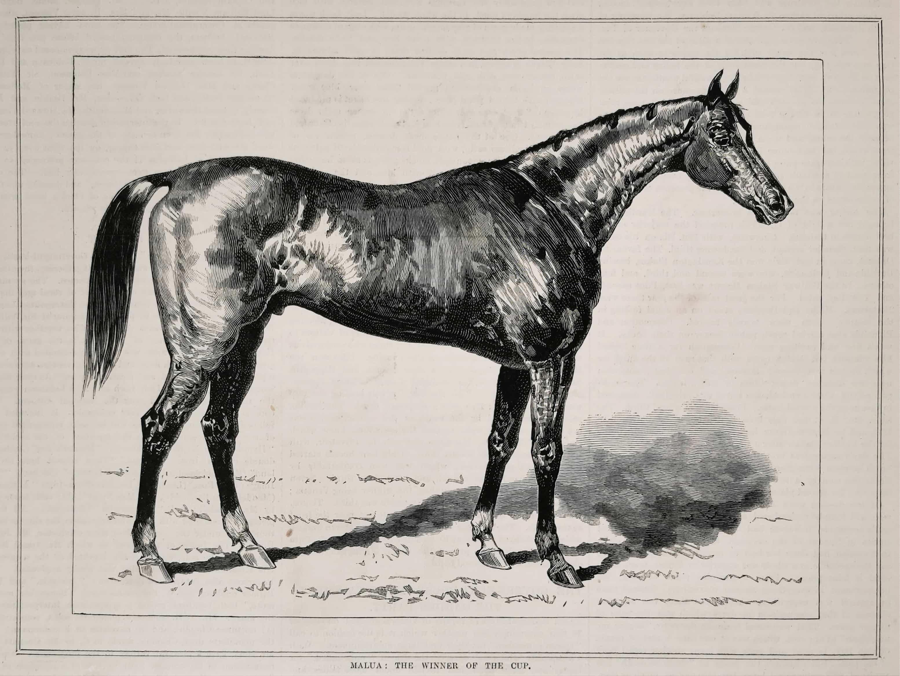 Colonial engraving of Malua, winner of the 1884 Melbourne Cup, carrying 9 st 9 lb (61 kg; 135 lb). Malua fought out the finish with Commotion (9 st 12 lb) to win by half a length. Malua was the most versatile Australian Thoroughbred racehorse in history winning over distances, ranging from 5 1⁄2 furlongs to 3 1⁄4 miles (1,100 – 5,200 metres).