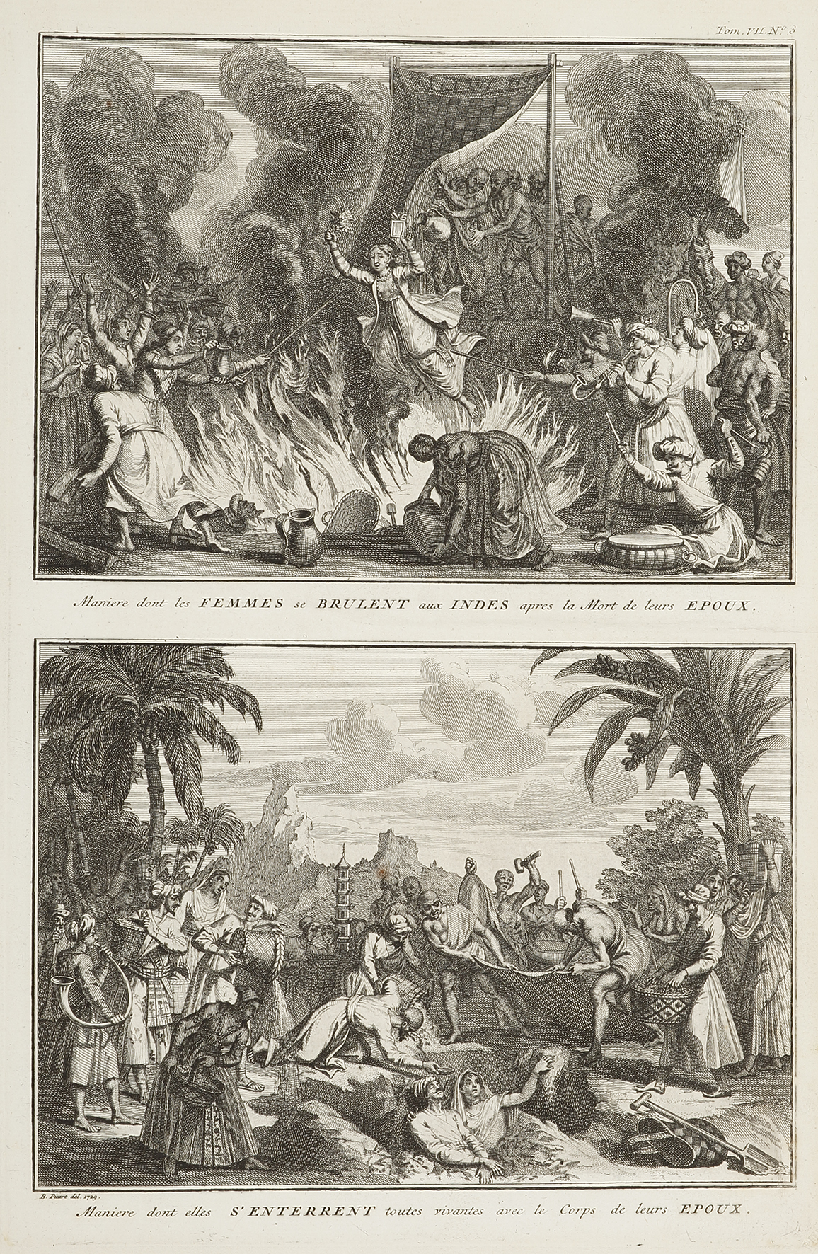 C.18th engraving of the Indian Hindu ritual of Sati or suttee, in which a widow sacrificed herself by sitting atop her deceased husband’s funeral pyre or by been buried alive. The Muslim Mughals, banned the practice. From Denis Diderot’s, Encyclopaedia which was a monument in the history of European thought, undermining the ancien regime and heralding the French Revolution. It was a permanent source for all aspects of eighteenth century knowledge. It was edited by the brilliant Denis Diderot (1713-1784).