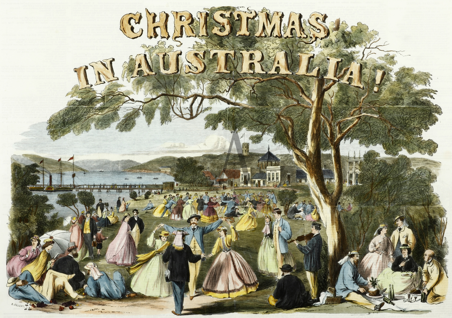 Rare, large c.19th engraved view of Manly Beach at Christmas time in 1865 .