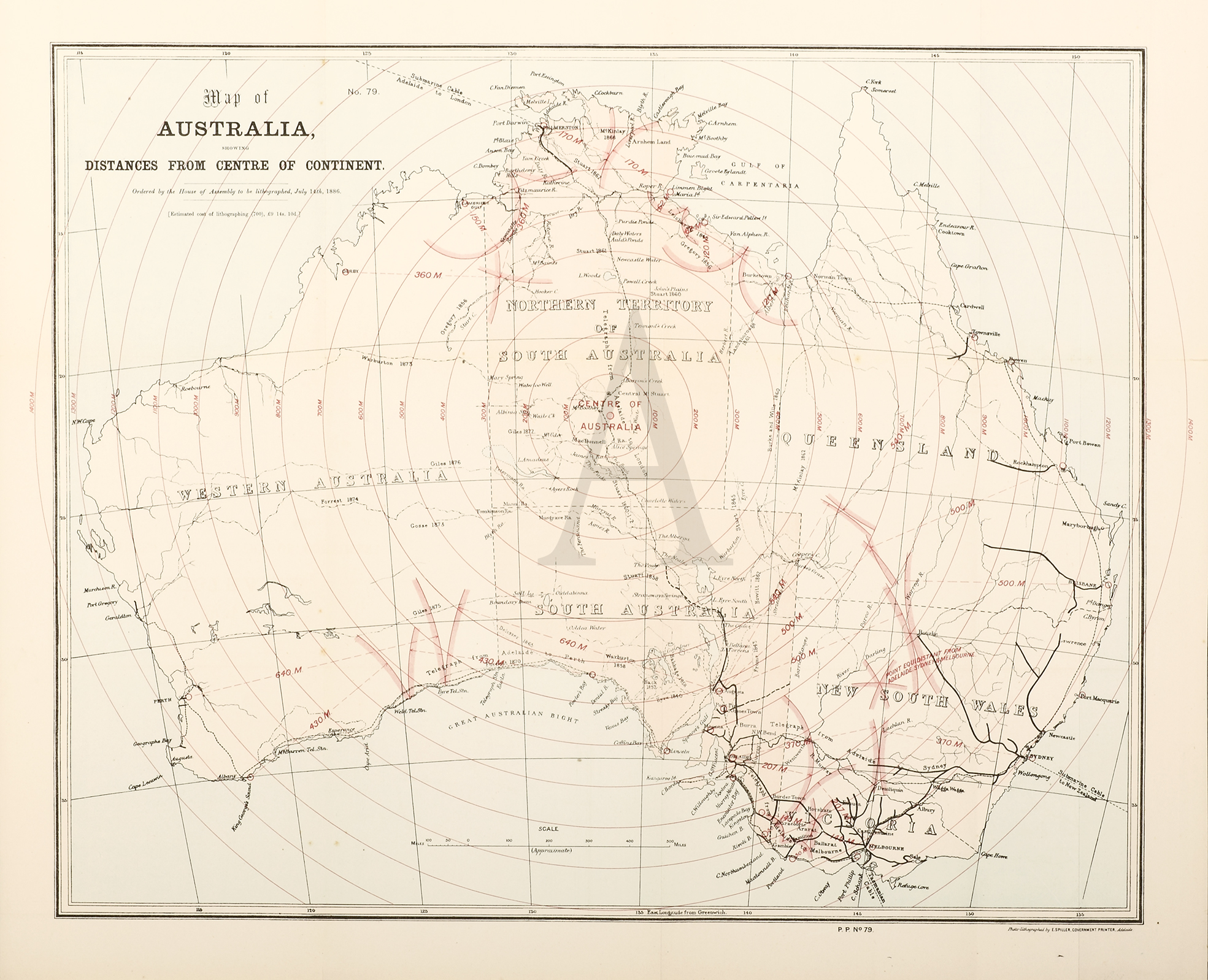 Map of Australia showing distances from Centre of Continent. - Antique Map from 1886