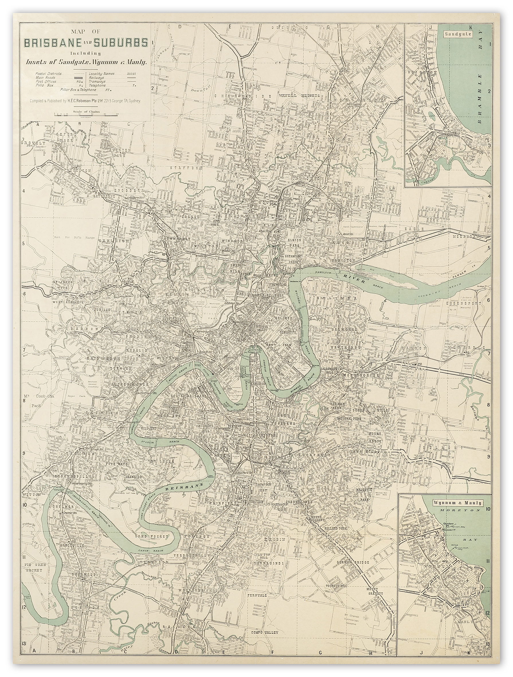 Detailed large scale map of Brisbane by Herbert Edward Cooper Robinson (1857?-1933) extending from Northgate to Yeerongpilly, showing tramway, railways, post boxes, public telephones, local authority names and boundaries. National Library Australia: Bib ID 1047201 (later edition of [1950?]