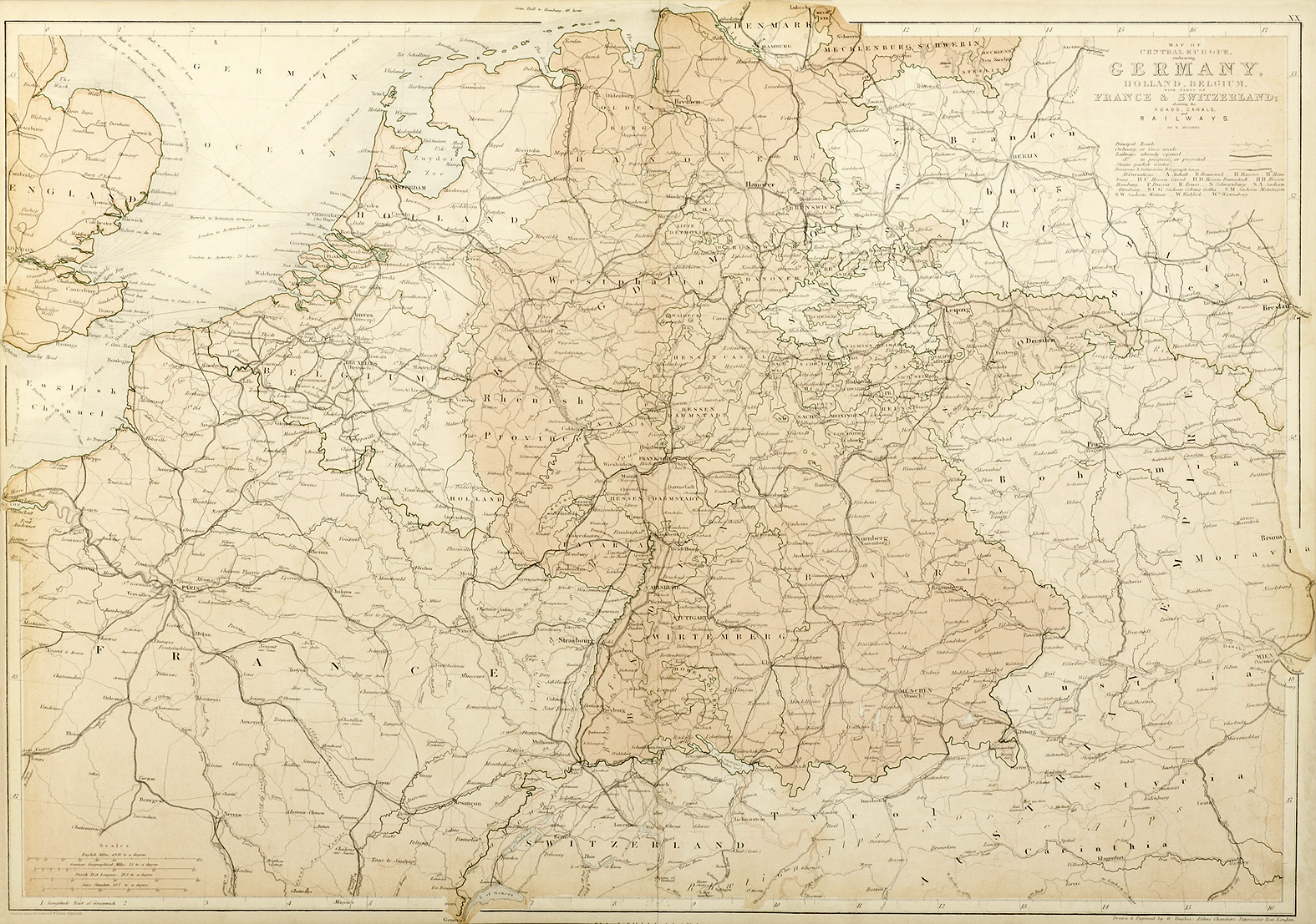 Map of Central Europe. Embracing Germany, Holland, Belgium, France & Switzerland; showing the Roads, Canals and Railways. - Antique Map from 1859