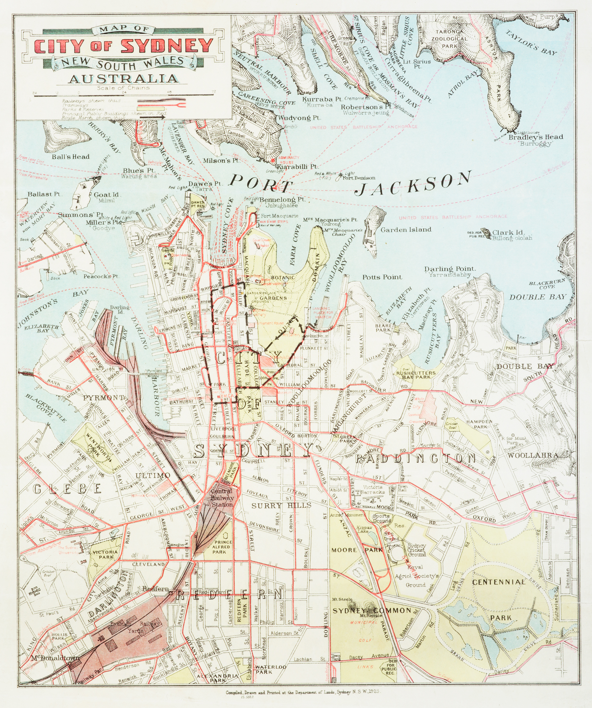 Detailed map of Sydney made for the proposed march of two thousand Blue Jackets from the visit of eight ships from the American Fleet in Sydney Harbour who arrived on 23 July and remained to 6 August 1925. The fleet comprised the following ships; USS California, USS Colorado, USS Tennessee, USS Maryland, USS West Virginia, USS New Mexico, USS Mississippi and USS Idaho.