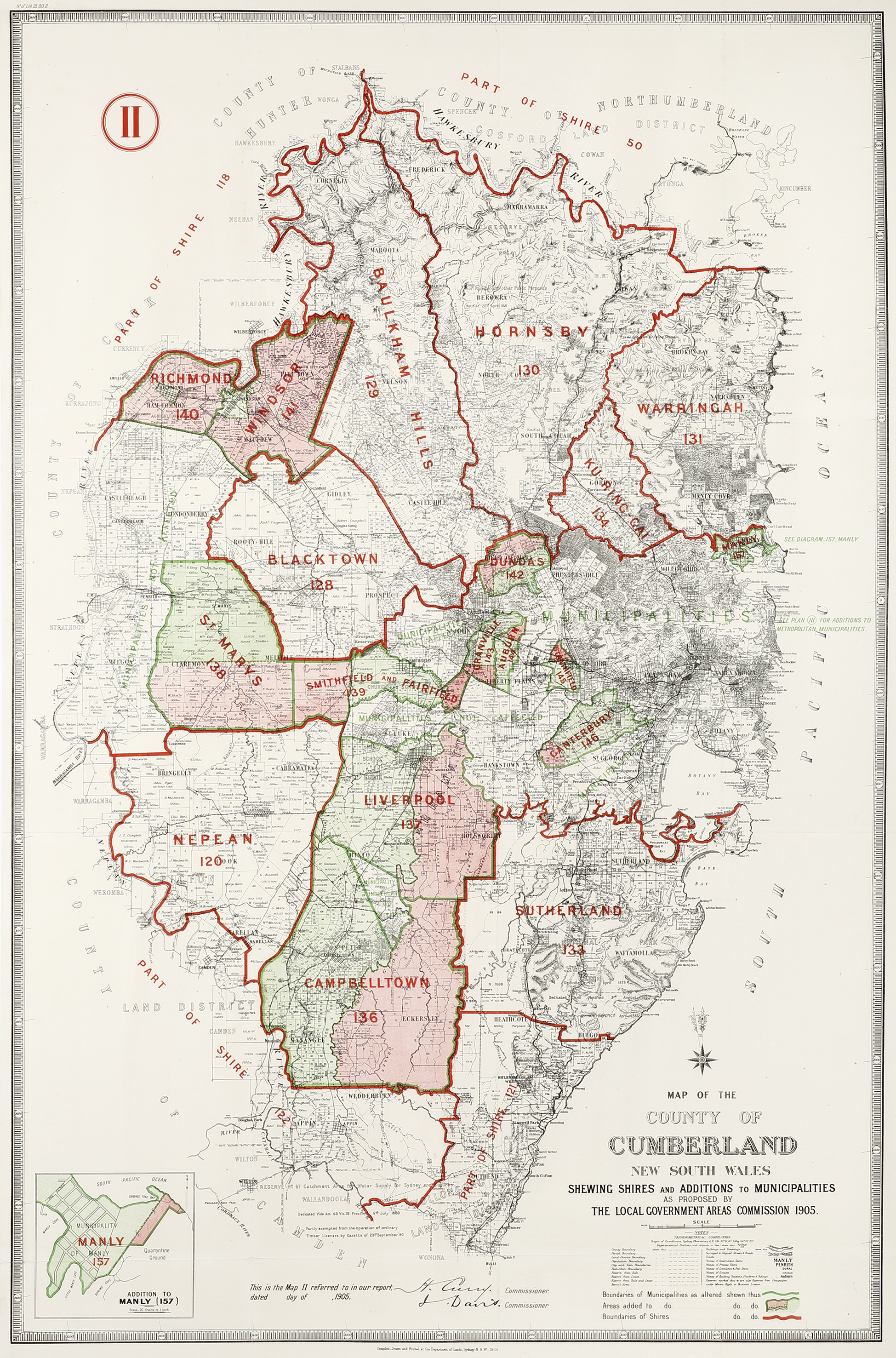 Scarce c.20th map showing the additions to municipalities as proposed by the local government areas commission in 1905. The map shows shire, municipal and county boundaries, numbered properties, some measured and with owners’ names, railways and tramways, towns, reserves, rivers and creeks.