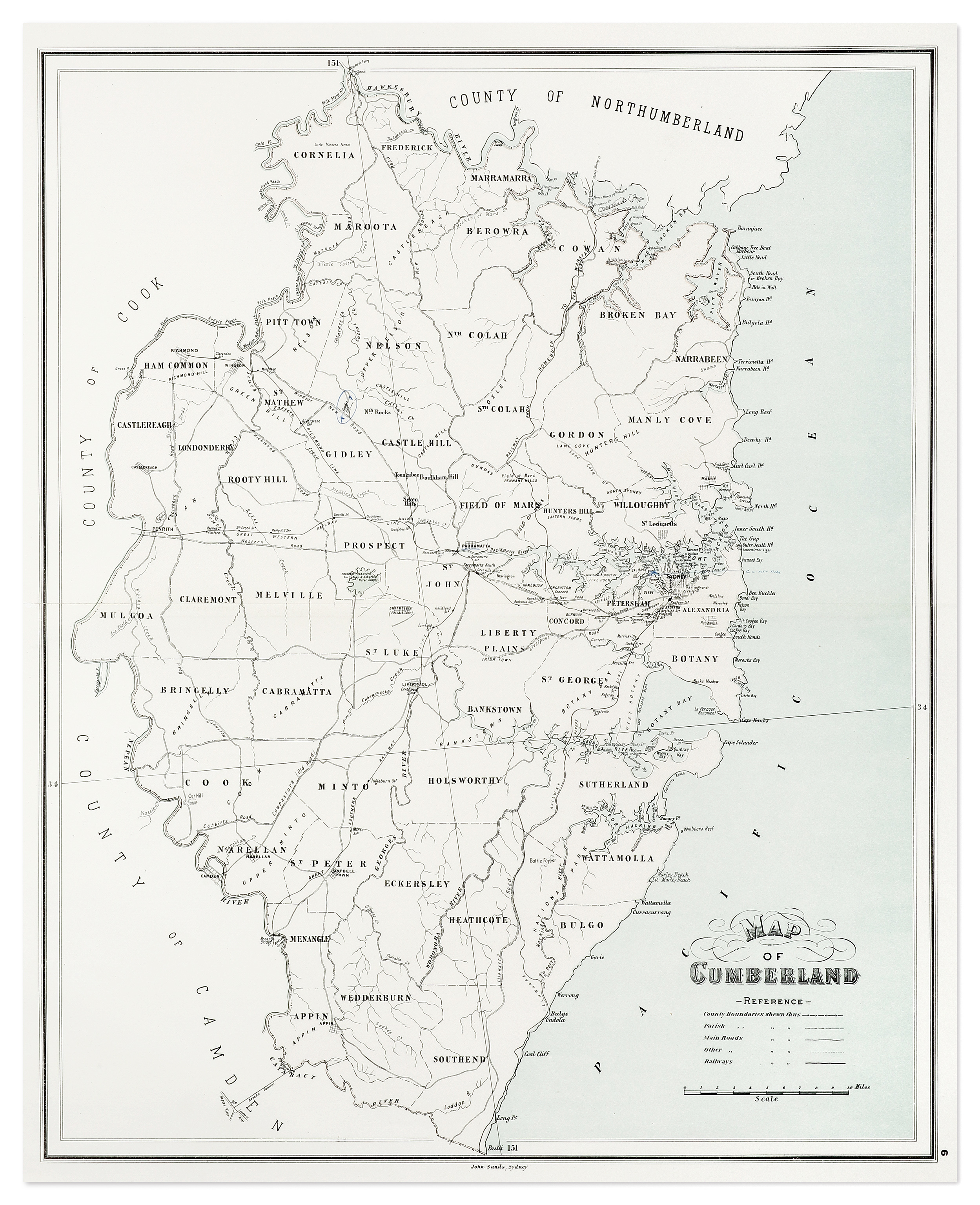 Scarce map of the County of Cumberland which extends from the Hawkesbury in the north, Penrith in the west and south to Bulli. Railways and rivers are marked as is the Royal National Park that was established in 1879 making it the second oldest national park in the world.