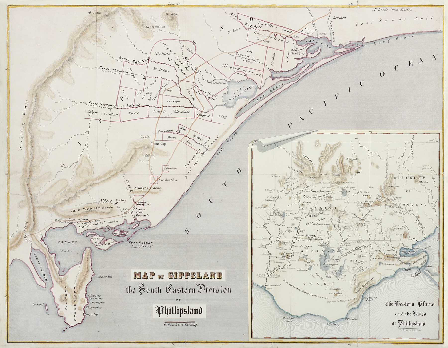 Rare early map of Gippsland with an inset of the “Western Plains and Lakes” at lower right.