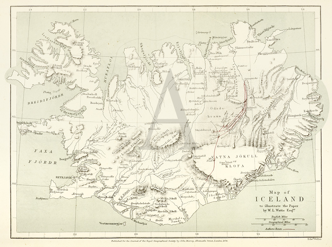 W.L. Watts and his Icelandic escorts became the first men to cross Vatnajokull in 1875. From the original edition of the Journal of the Royal Geographical Society.