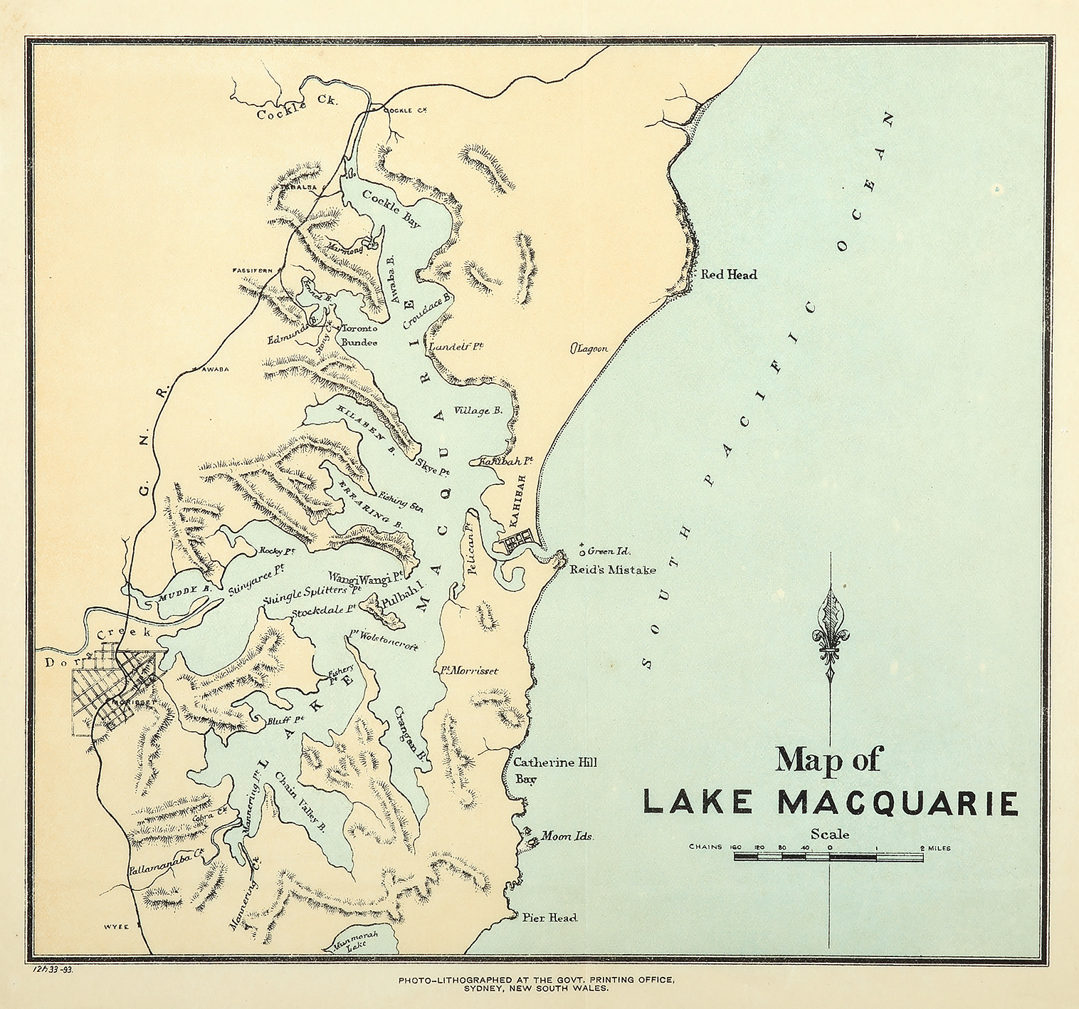 Scarce c.19th colour lithographic map of Lake Macquarie, New South Wales.