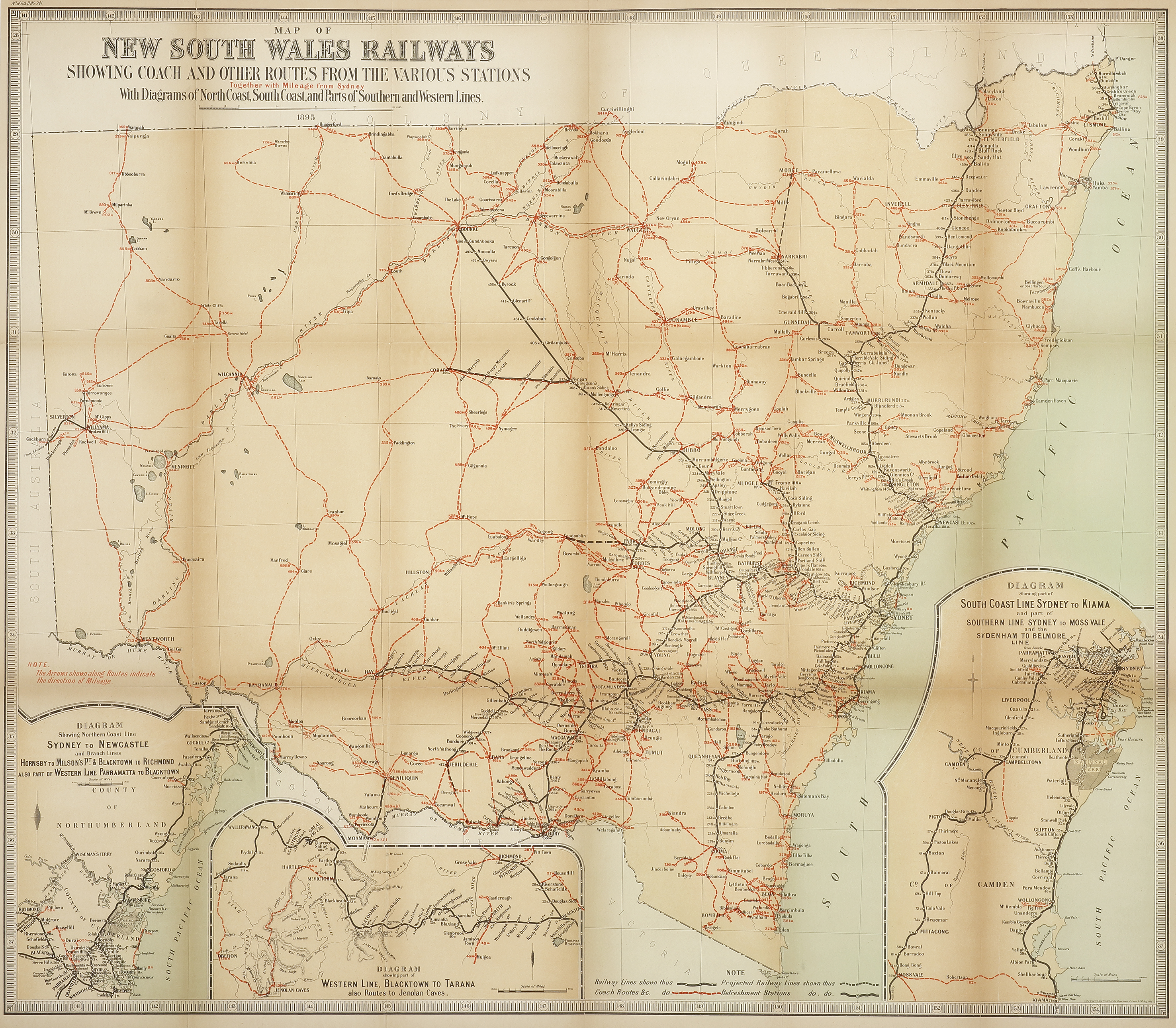The map extends from Point Danger to the Victorian border with insets of, ‘Northern Coast line, Sydney to Newcastle’, ‘Western Line, Blacktown to Tarana’ and ‘South Coast Line Sydney to Kiama’. Shown are railway lines in black, coach routes in red, “projected” railway lines and refreshments stations.