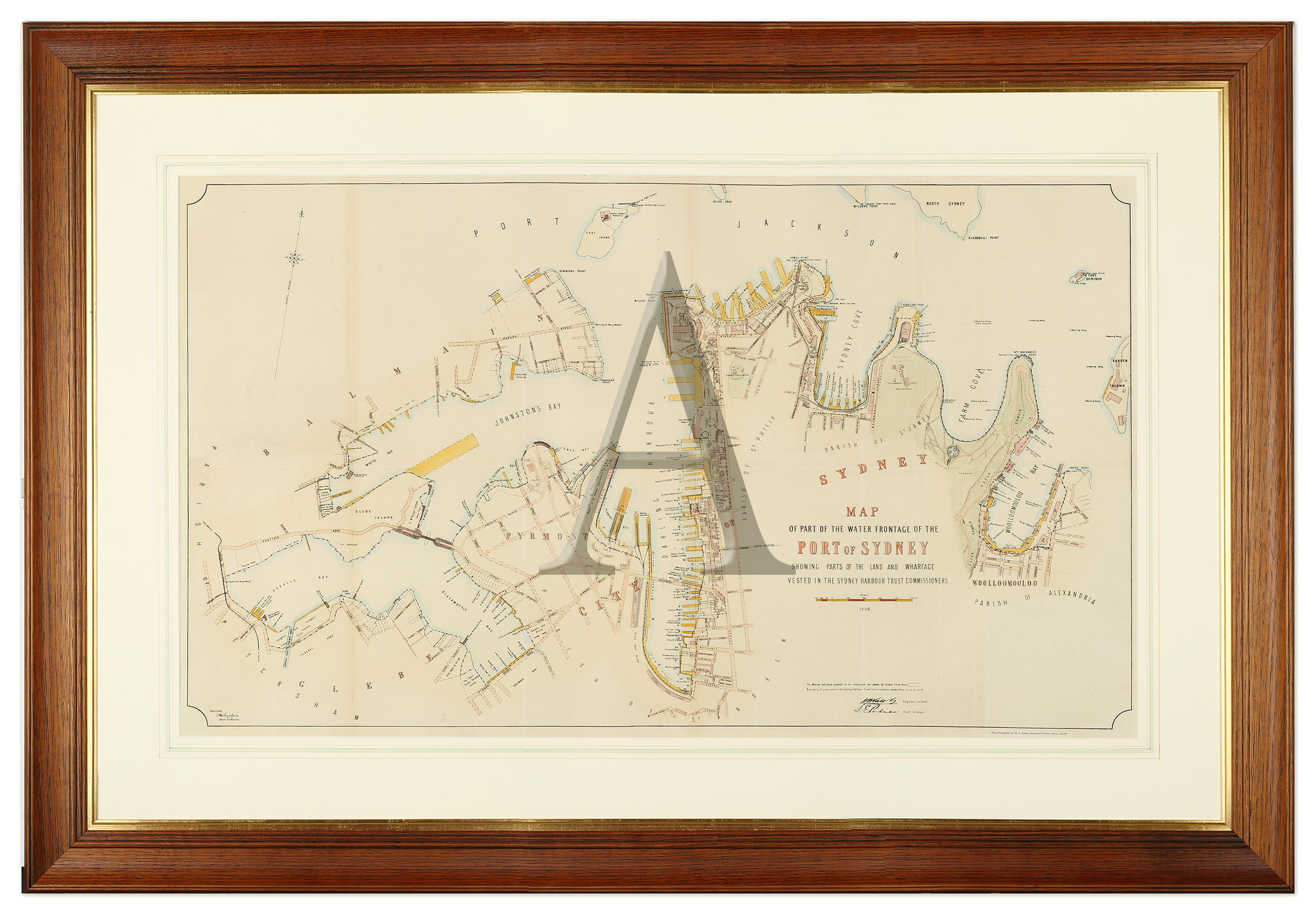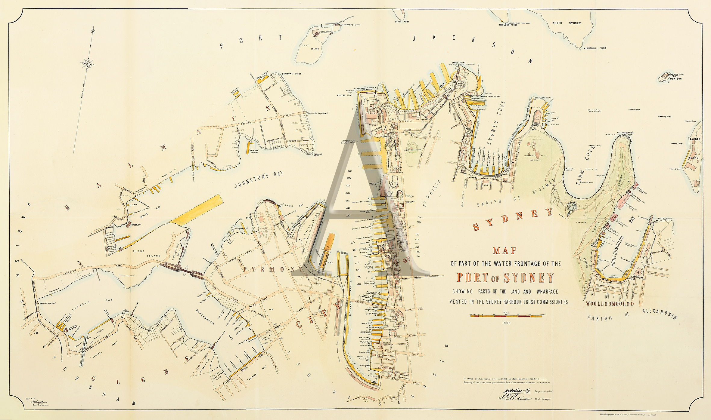 Rare, large scale detailed map of Sydney, extending from Balmain to Woolloomooloo. This was the most complete and up-to-date survey of the harbour and wharves. A colour key at lower right. Rare.