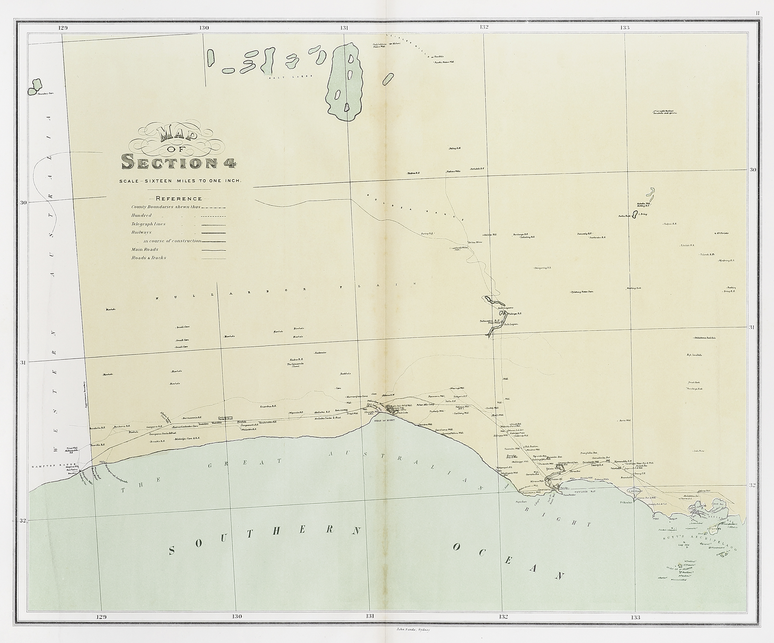 Area from West Australian border in the west to Denial Bay in the east and Leisler Hills in the north and the Great Australian Bight in the south. Scarce county map of South Australia from the first atlas devoted to the continent issued in Australia.
